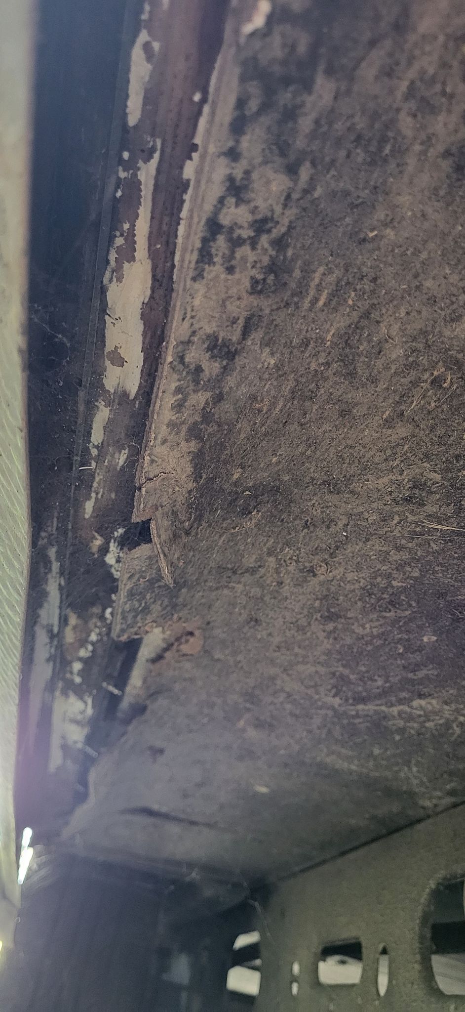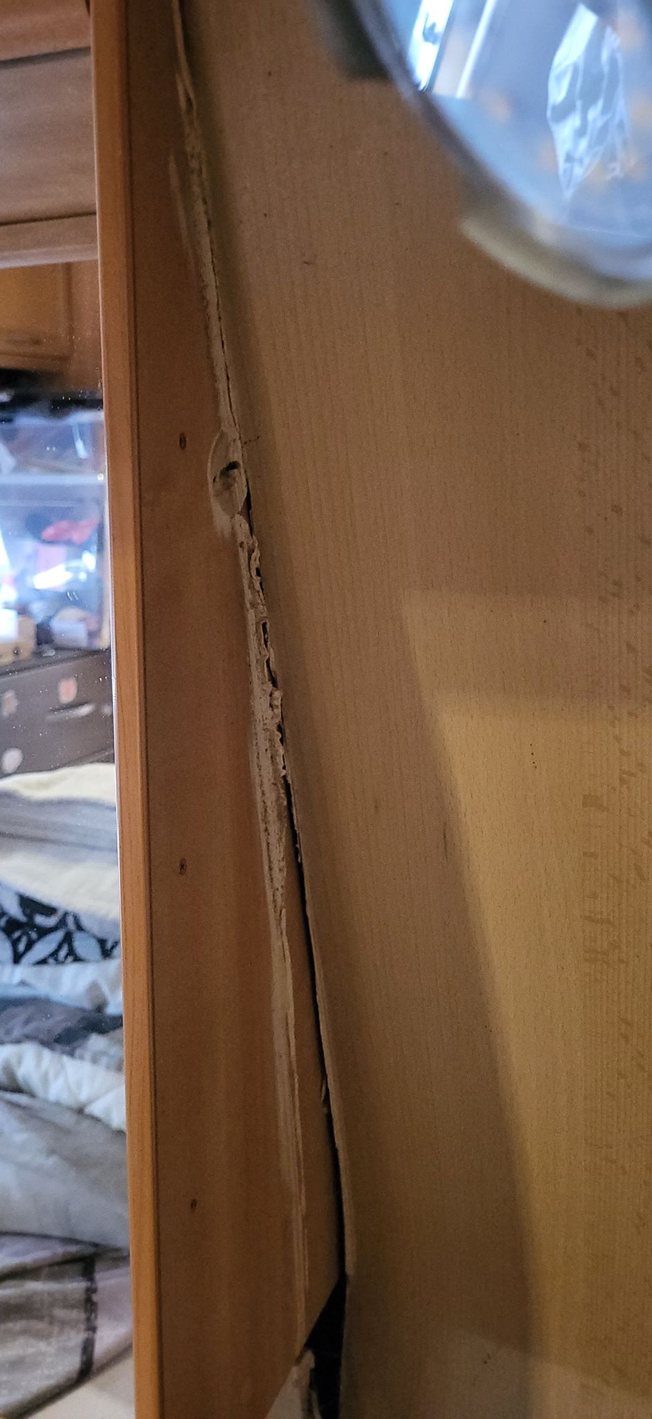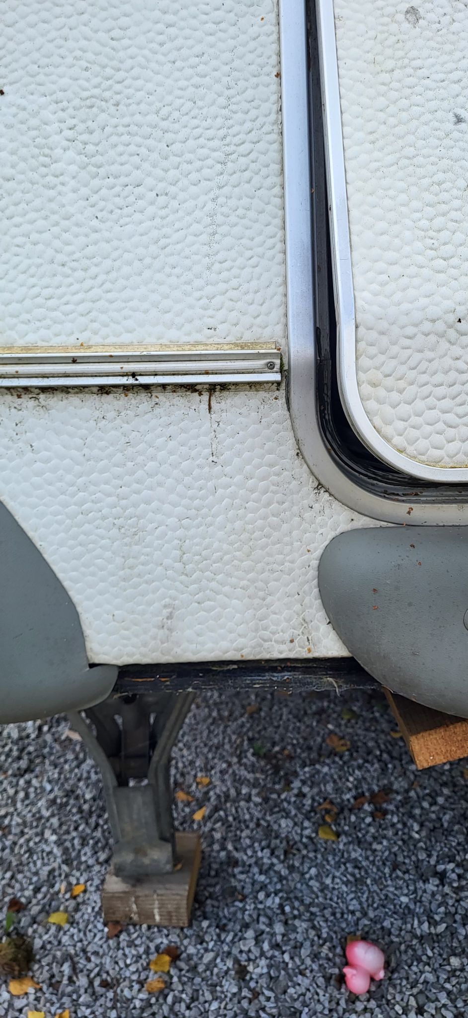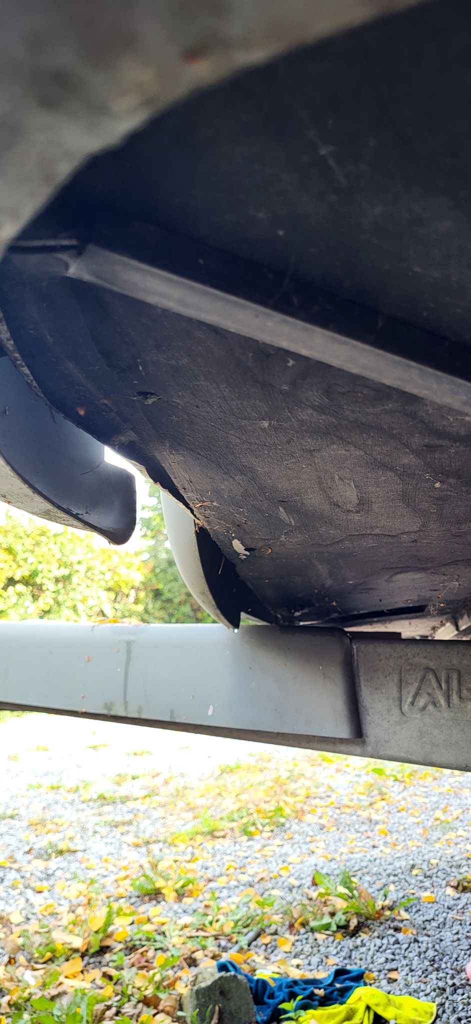 Une partie du plancher (une petite partie, 8n30 de long la cellule) s'est désolidarisée du bas de caisse et a pris l'eau : la faute a une fuite à l'interieur de la caravane, réparée depuis, et aussi sans doute la faute au tiroir du salon qui se trouve à cet endroit là (l'eau doit sans doute perler).