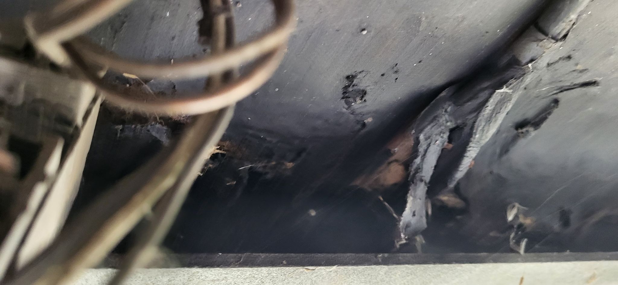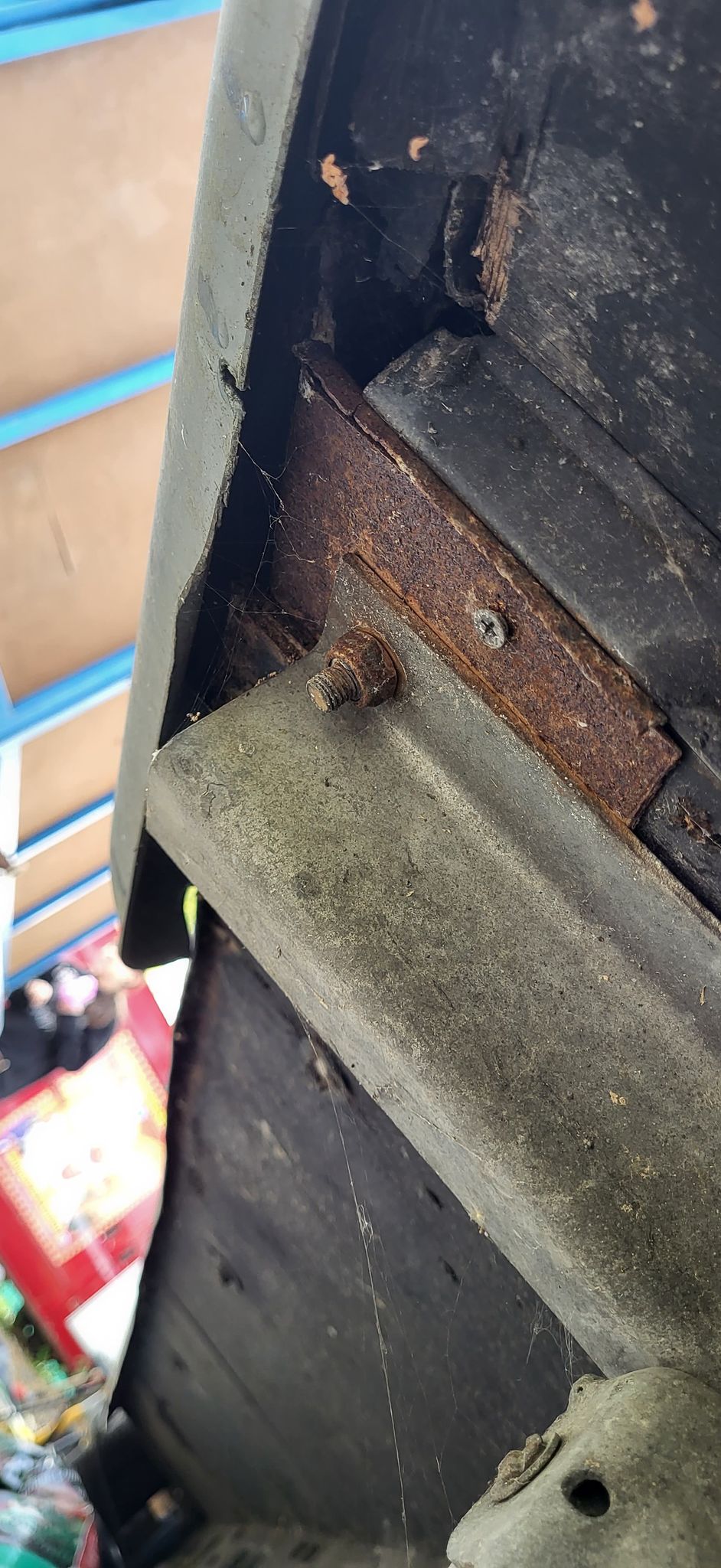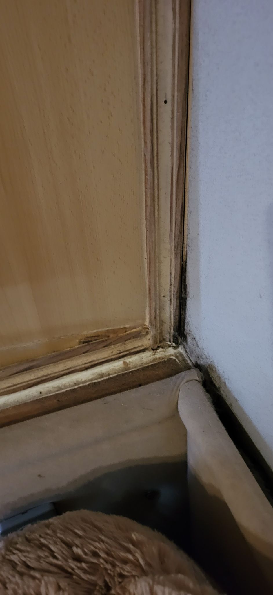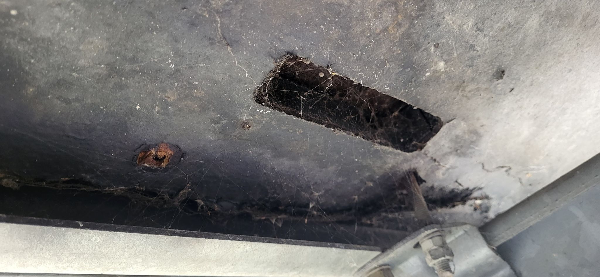 Une partie du plancher (une petite partie, 8n30 de long la cellule) s'est désolidarisée du bas de caisse et a pris l'eau : la faute a une fuite à l'interieur de la caravane, réparée depuis, et aussi sans doute la faute au tiroir du salon qui se trouve à cet endroit là (l'eau doit sans doute perler).
