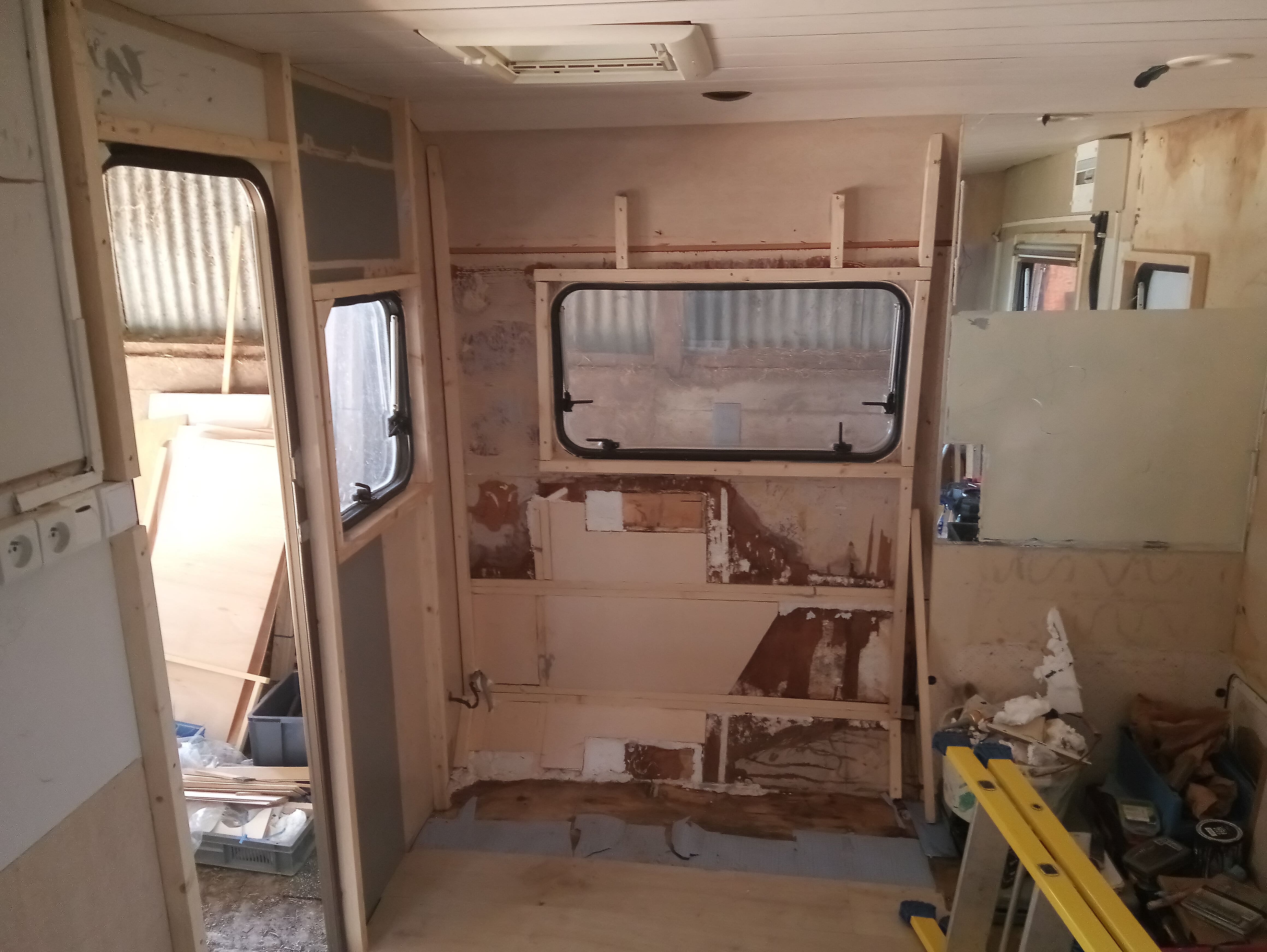Une infiltration d'eau due à un choc de la caravane présent lors de l'achat de la caravane m'a fait démonter toute une partie d'une paroi pour remplacer ce qui était à changer :