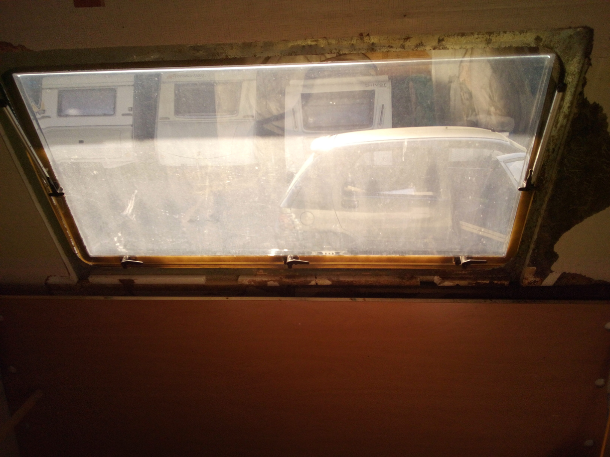 Bilan : le joins de coffre ne peux plus tenir agrafé et il est tombé. C'est d'ailleurs en constatant cela que je me suis rendu compte du problème. A l’intérieur de la caravane, le revêtement en dessous de la baie se dégrade fortement. Cependant, la baie reste solidement fixée car les 3/4 du panneau qui l'encadre est toujours sain…