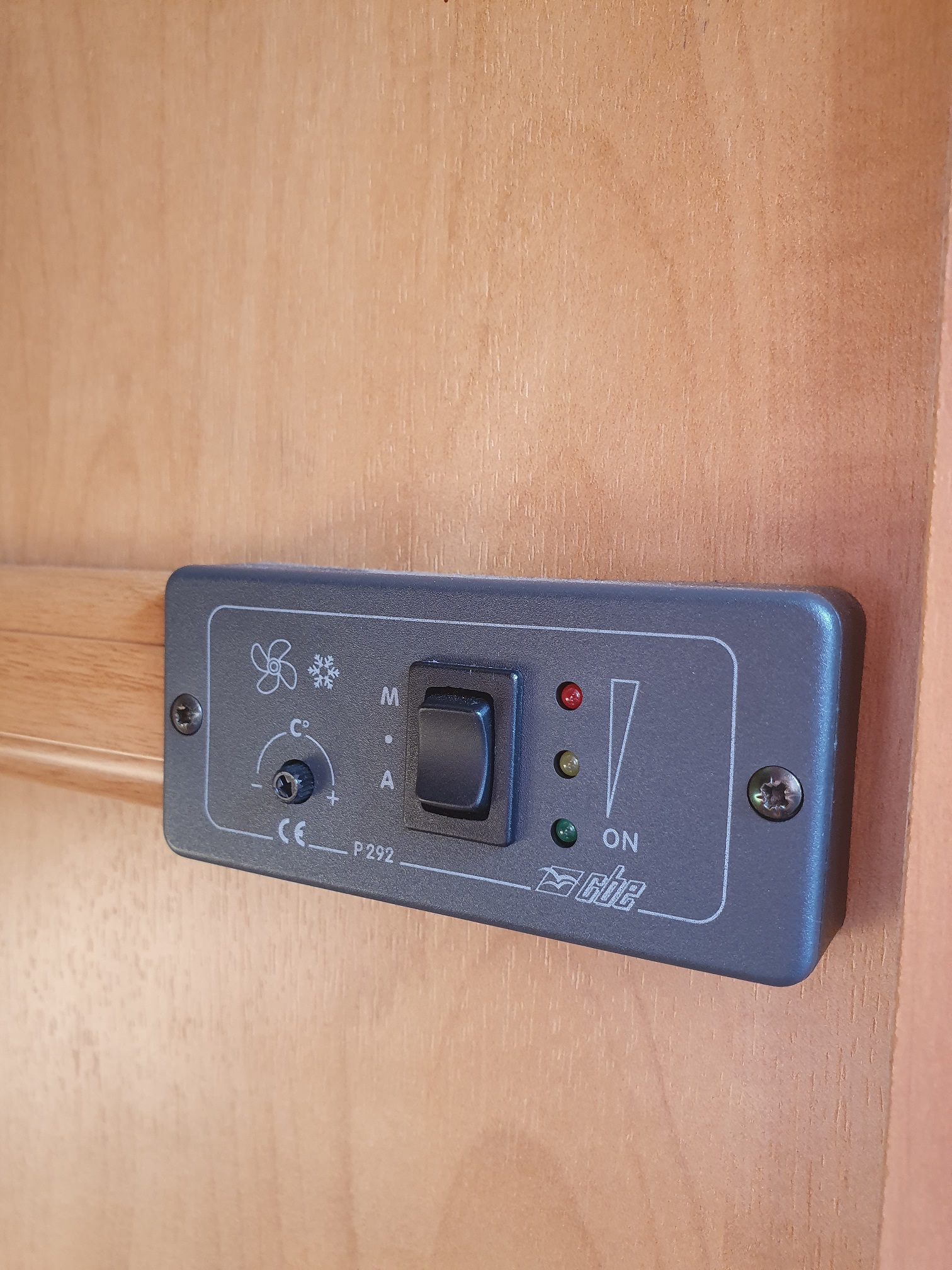 La caravane est équipée d'un grand frigo + congel qui ont bien fonctionné cette été au camping, mais j'ai vu une petite commande dans la penderie (voir photo) avec 3 positions : "A" "." (un point) et "M" avec 3 petites diodes vert pour le A, rouge pour le M et à priori rien pour le point.