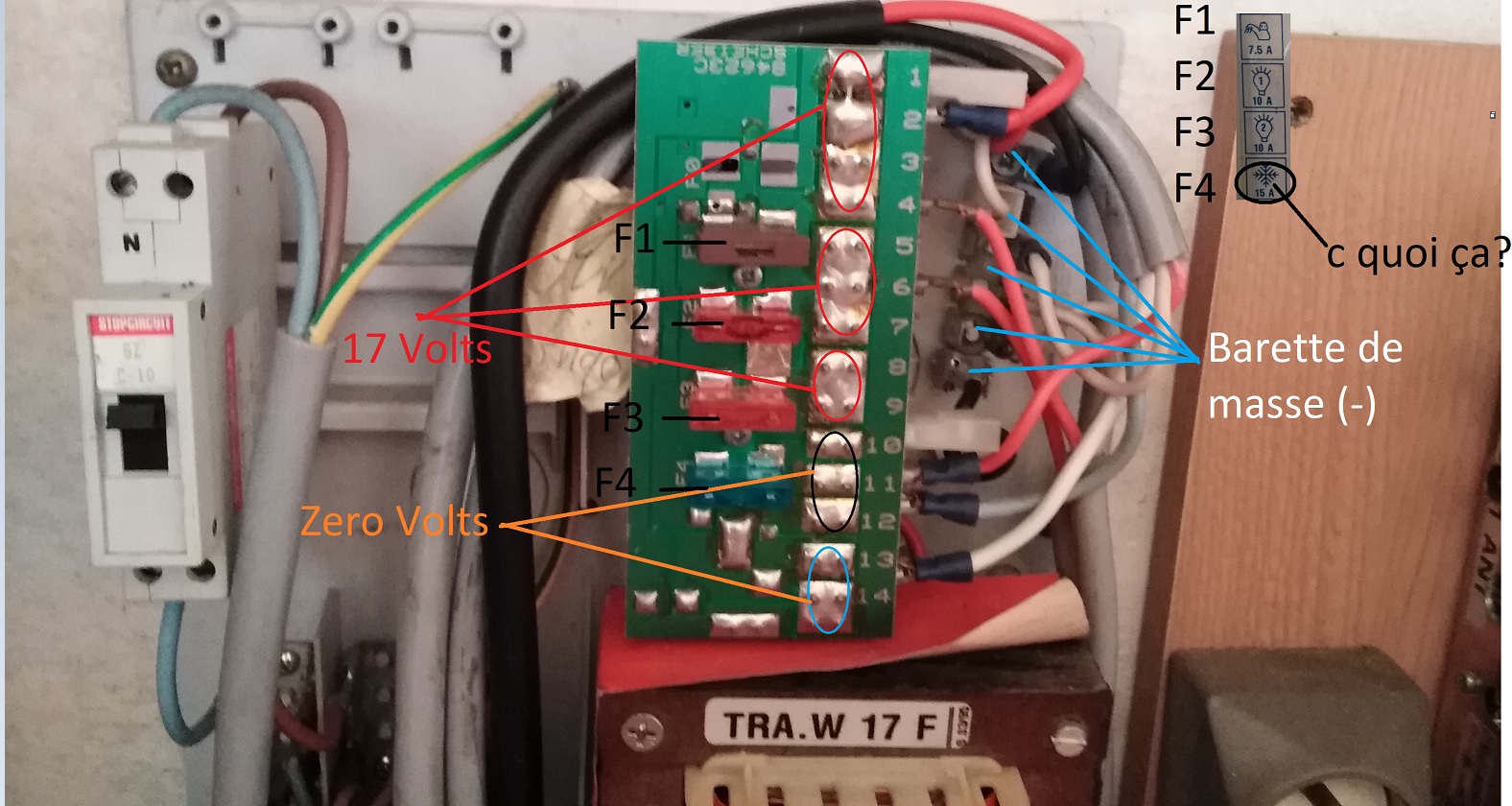 j'ai relevé 17 V au voltmètre continue. (voir shéma), ma question est que comment brancher ma batterie en parallèle car je suppose qu'il faut être devant les fusible afin de garder une sécurité.