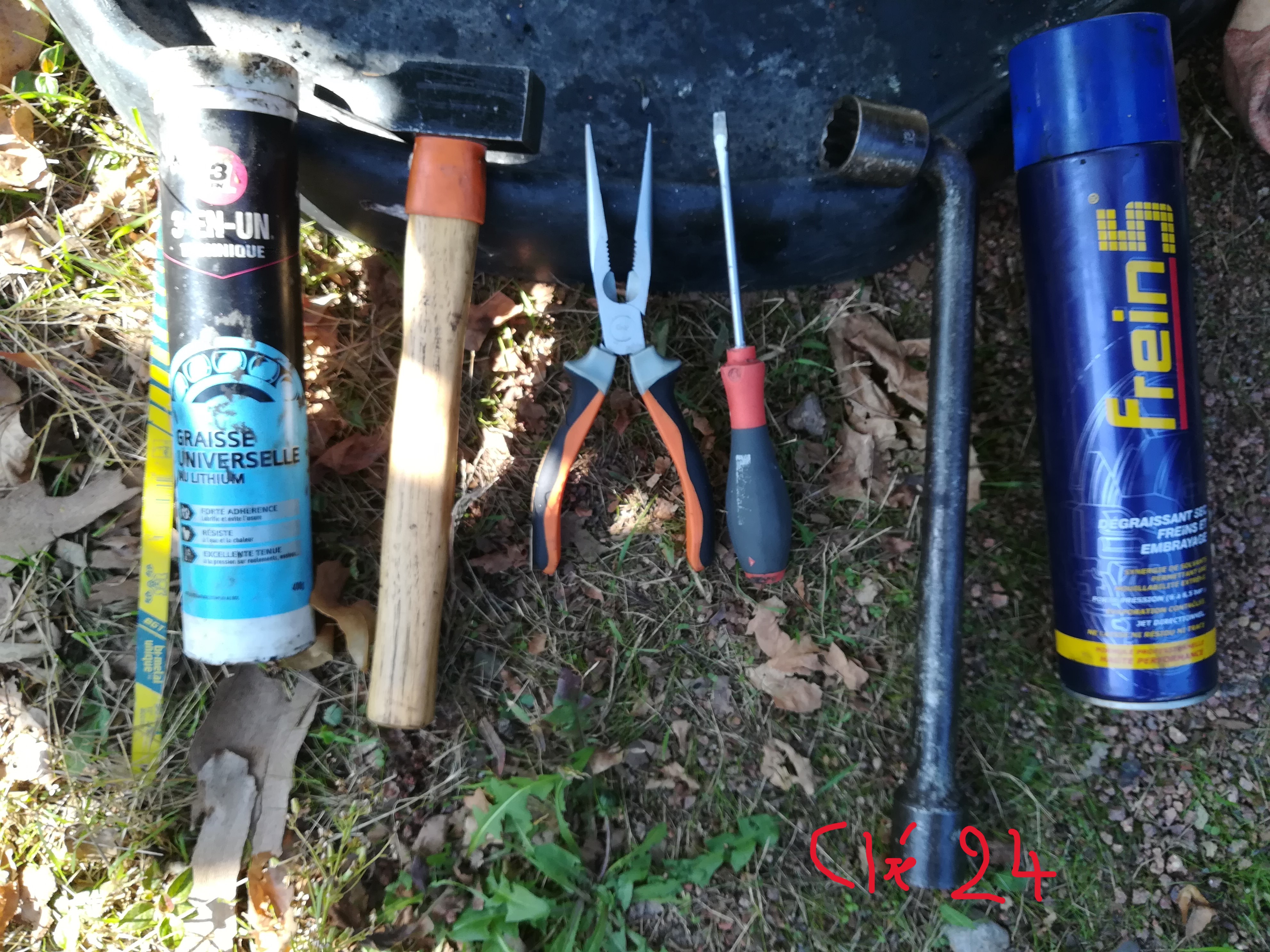 puis l'écrou de 24, au moins jusqu'à avoir l'accès au trou de goupille pour pouvoir la remettre en place. une fois la goupille en place, bien retordre les 2 cotés pour essayer de faire en sorte que la goupille ne puisse pas ressortir de son logement.