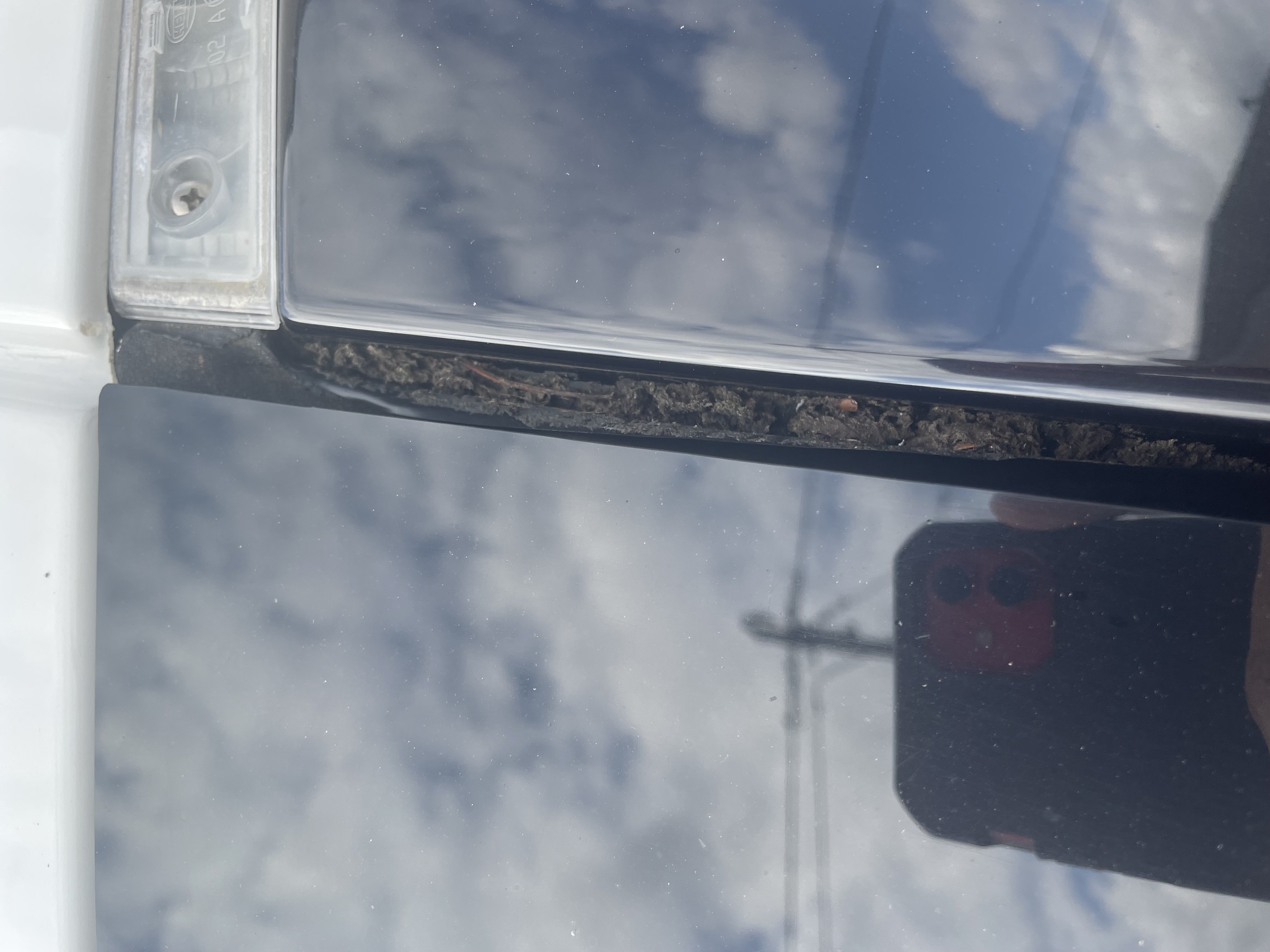 Là où j’ai un doute, c’est sur l’état du joint en façade. Bien caché entre la partie latérale et la vitre noire de garniture de la face avant (voir photo) je constate la présence d’une sorte de bande de tape noir qui part de la gouttière de toit jusqu’au coffre avant.