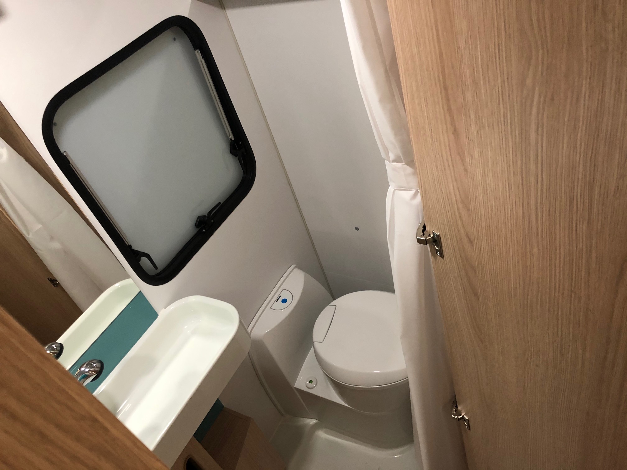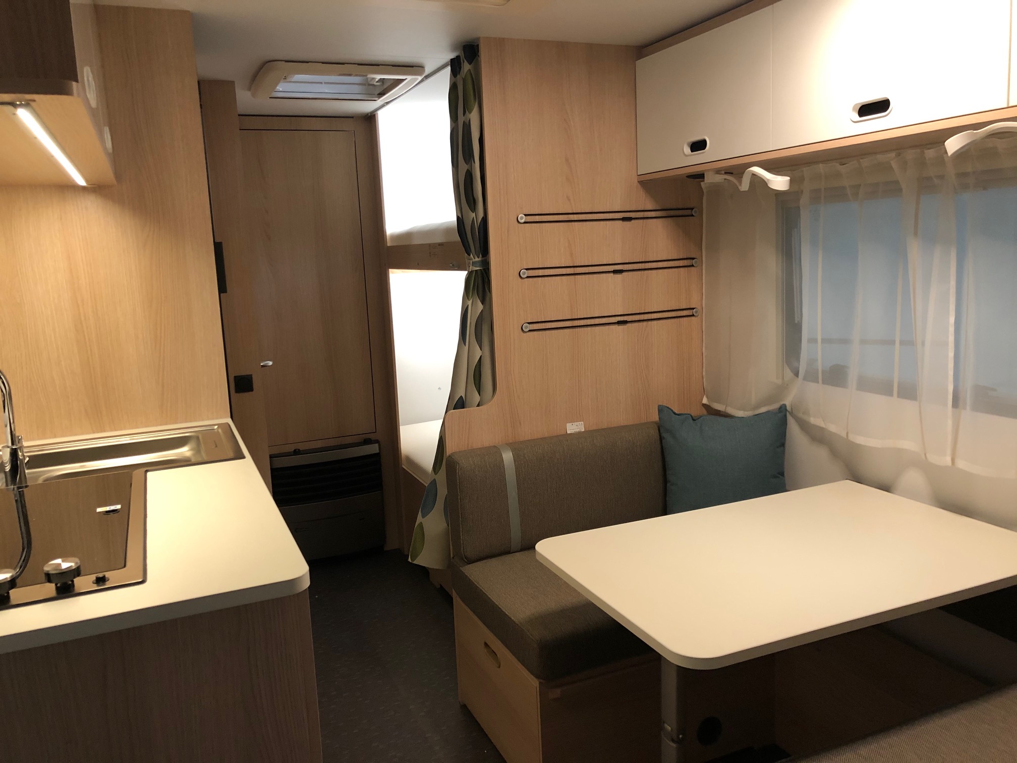 Pour le marché Benelux, elle est équipée de série d'un grand lanterneau, d'une fenêtre sur la face avant, toit polyester, AKS, amortisseurs, roue de secours, récepteur bluetooth avec haut-parleurs (que nous n'avons pas pu tester, aucune idée de la qualité...), prises USB un peu partout, moustiquaire de porte, chauffage gaz Truma S3004, chauffe-eau électrique 5l.