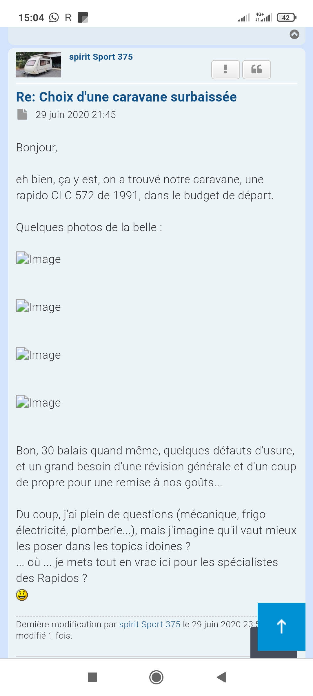 Je vois que tu as quelques altérations dues à l'humidité au niveau de la barre de pliure du toit: pas d'inquiétudes non plus: cette barre de 5cm est le seul endroit ou les Rapido ne sont pas isolées et il est plus froid que le reste; La condensation intérieure s'y dépose donc naturellement . Seul remède: un bon chauffage couplé avec une bonne aération.