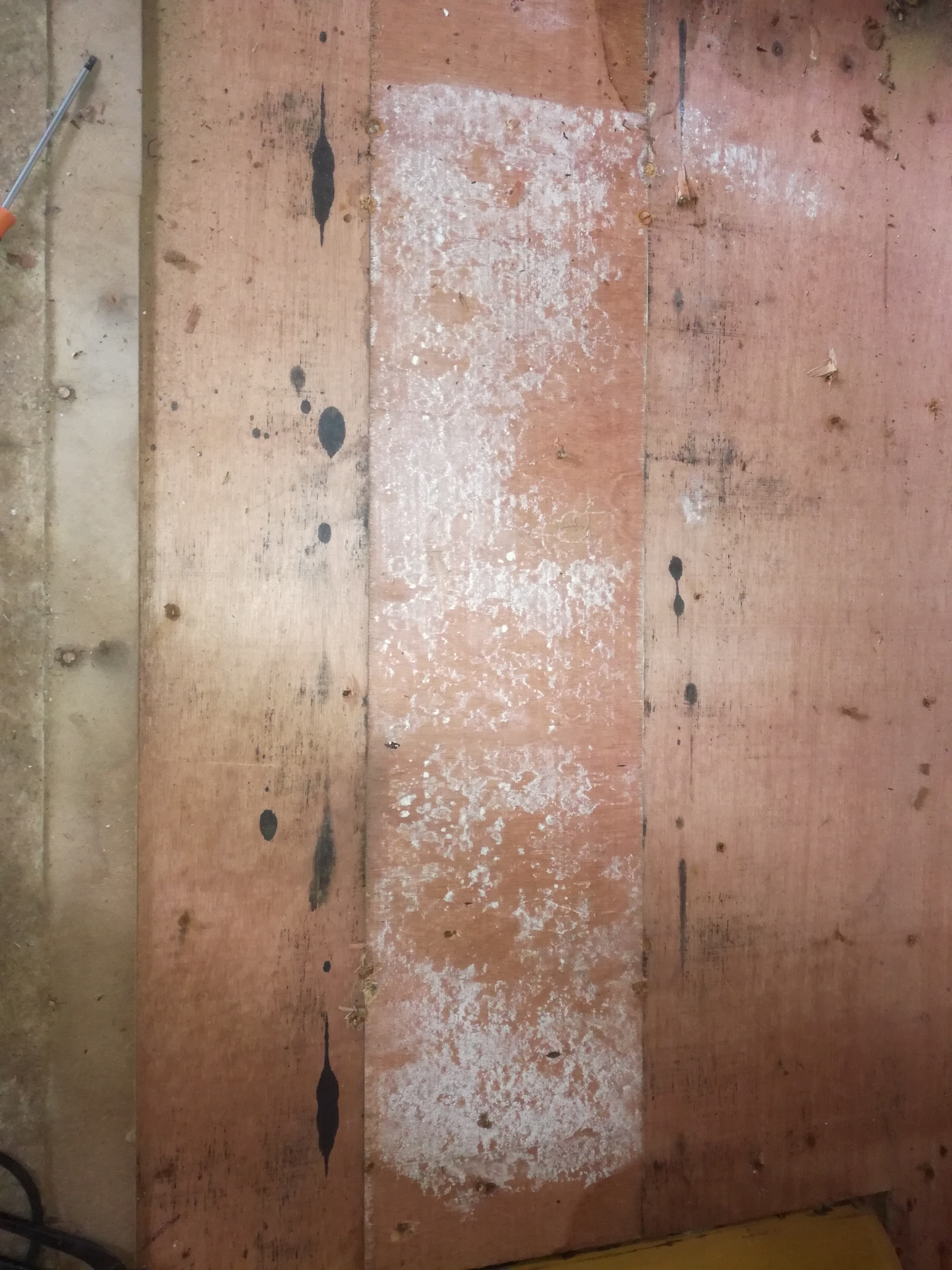 le contreplaqué du dessous n'est pas atteint, au milieu il y a un genre daglo qui lui est imbibé sur les bords et le contreplaqué du dessus parait bon. Nous en saurons plus après avoir entièrement enlevé le lino et mettron les photos ici.