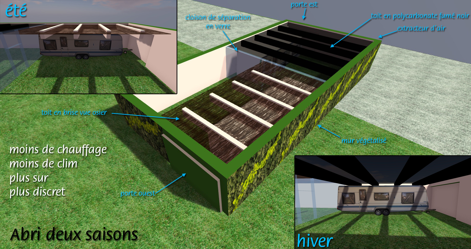 une solution à laquelle j'ai pensé en 3D, rentabilisé en chauffage/clim sur quelques années, autoconstruction en bois/torchis, je pense que le cout de ce système pourrait être autour de 3000€ à 4000€. On change de place à la caravane en été et en hiver
