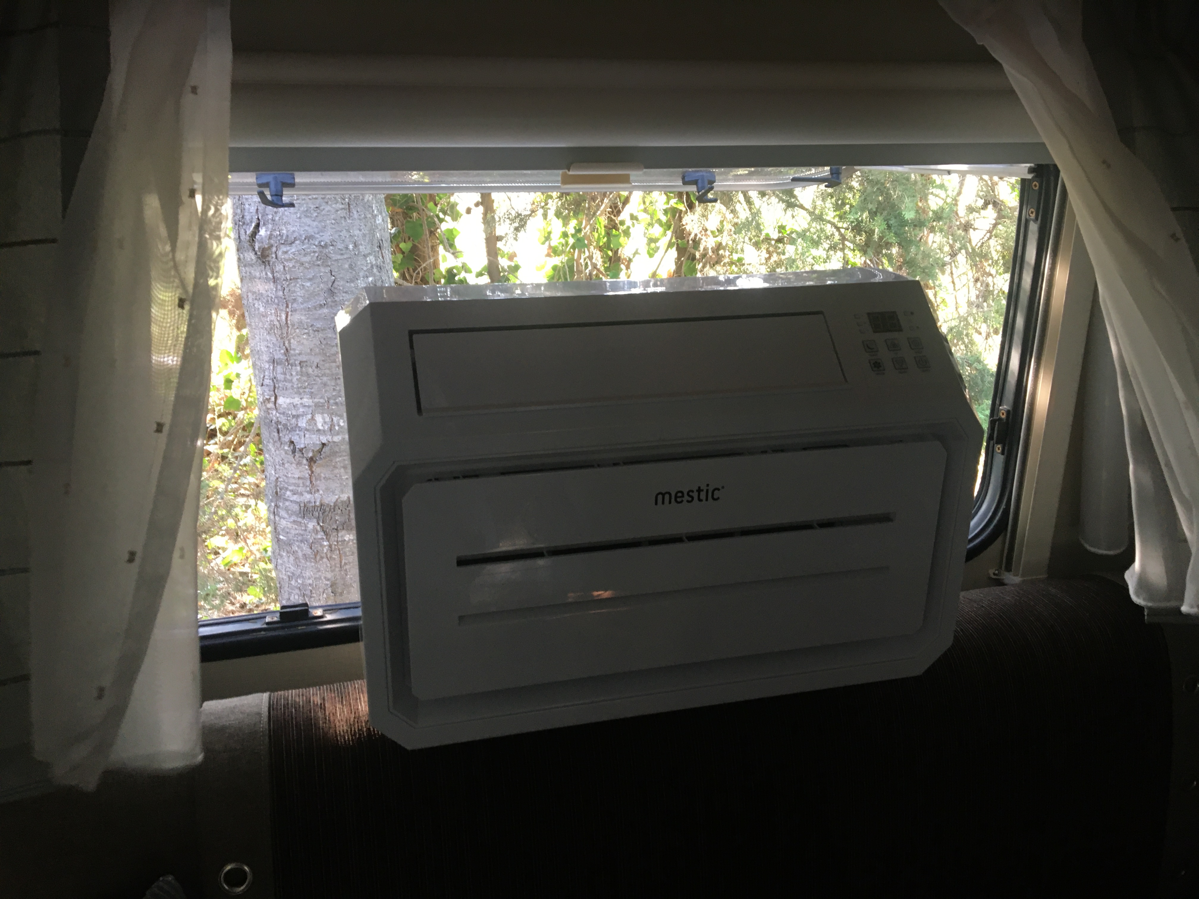 Autre investissement : une climatisation installée sur la baie de la dînette, avec un cache maison , puisque je ne pouvais pas baisser le store moustiquaire ni occultant.. du coup , il ne fait pas d’ombre dans la caravane la nuit et c’est un boulevard à moustiques etc..