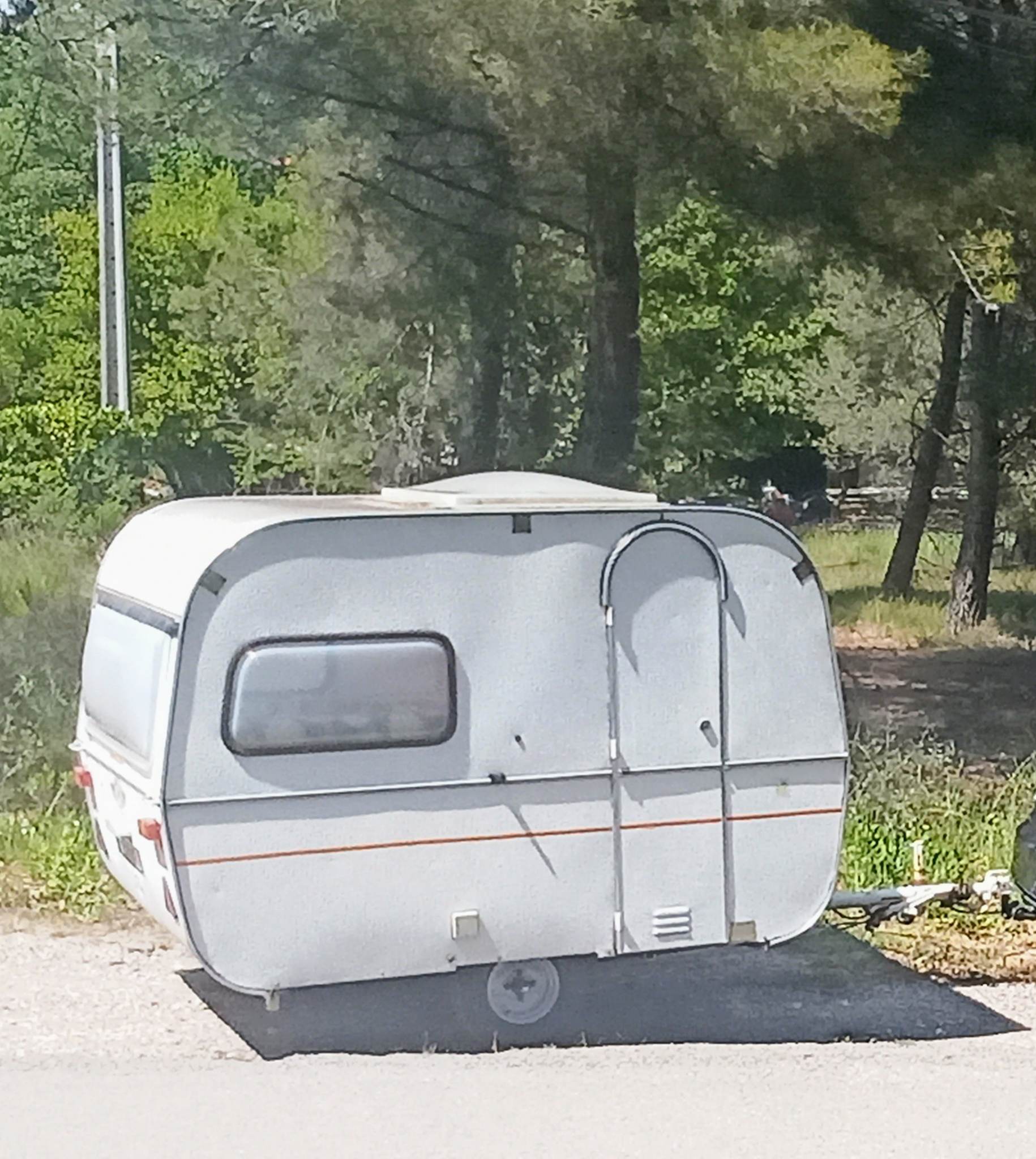 C'était une caravane légère : 730 kg à vide, pesée au contrôle technique, après 14 ans d'âge..... 800 kg en charge ! tractée par une petite corolla 1300 essence ! Pas de boiseries, de déco superflues... pas de grosses lourdes portes aux armoires, juste de fines cloisons à gliss!ères qui se fermaient dans une encoche pour tout mécanisme ! et qui ne s'ouvraient pas sur la route ! pas de boiserie non plus devant le frigo, juste le frigo et puis c'était tout ! et encore, pas de séparation entre l'armoire sous l'évier et le frigo : au-dessus du frigo régnait une douce chaleur, c'était l'endroit où je faisais sécher les chaussures mouillées de mes petits bandits !