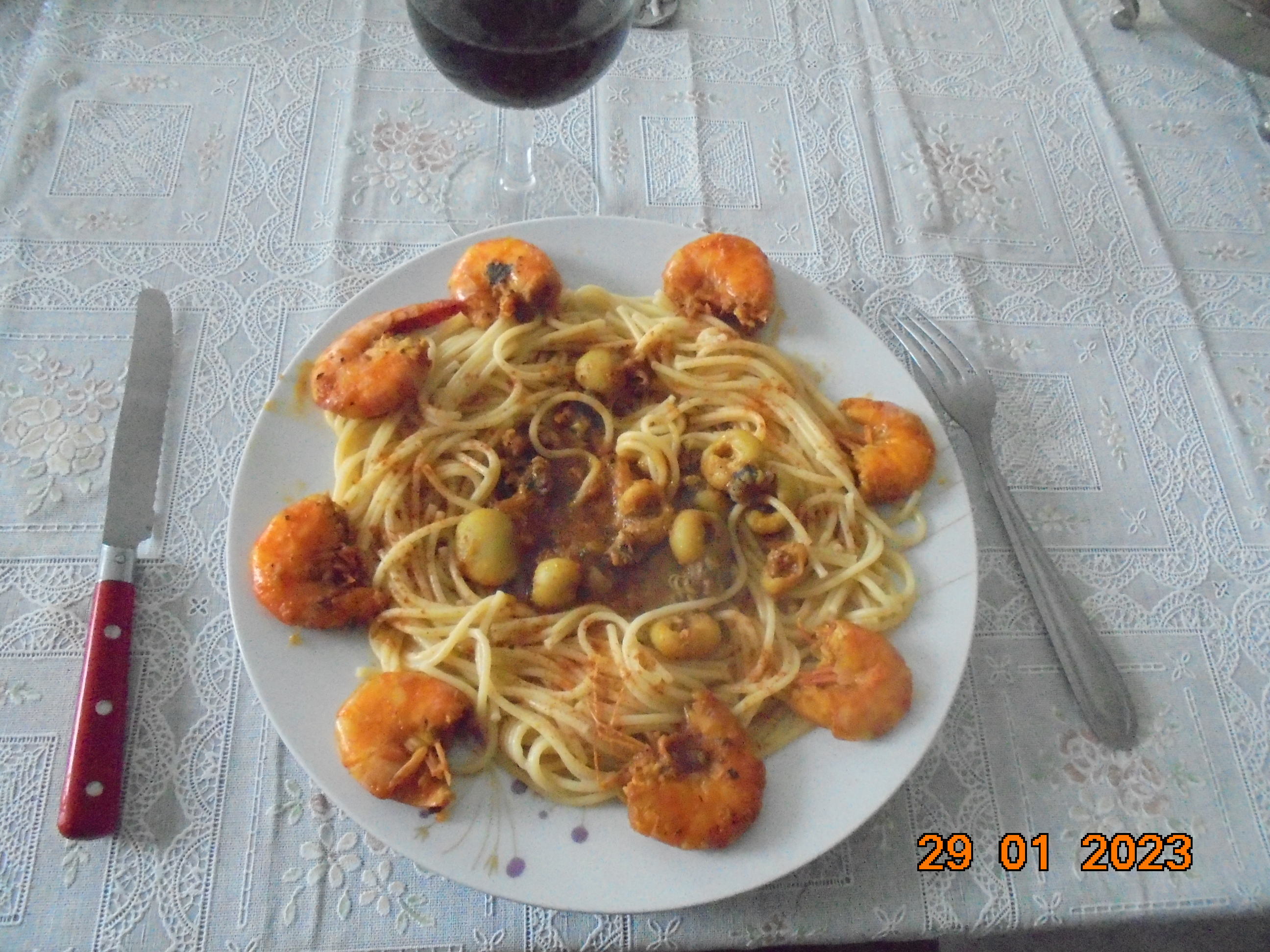 J'ai laissé mijoter hier, très lentement, des supions avec de très grosses crevettes roses, du coulis de tomate maison, de l'ail et des échalotes ciselées, sel, poivre. Et ce midi, avec ça, des spaghettis.