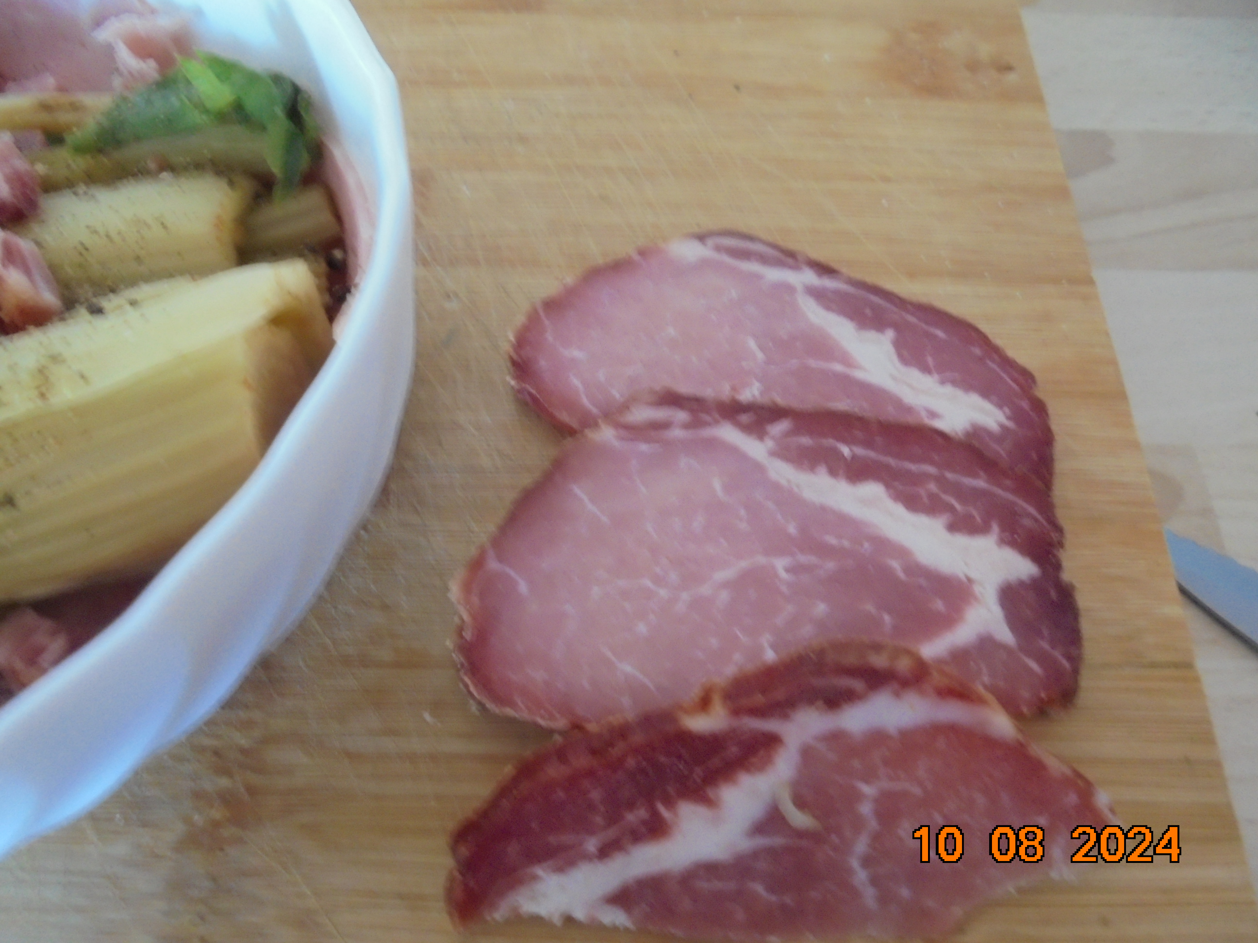 Pour ce midi, j'ai préparé un gratin de céleris avec comme ingrédient, céleris de mon jardin, jambon, crème semi-liquide, Comté et le reste des côtes de porc fumée des Vosges accompagné de riz.