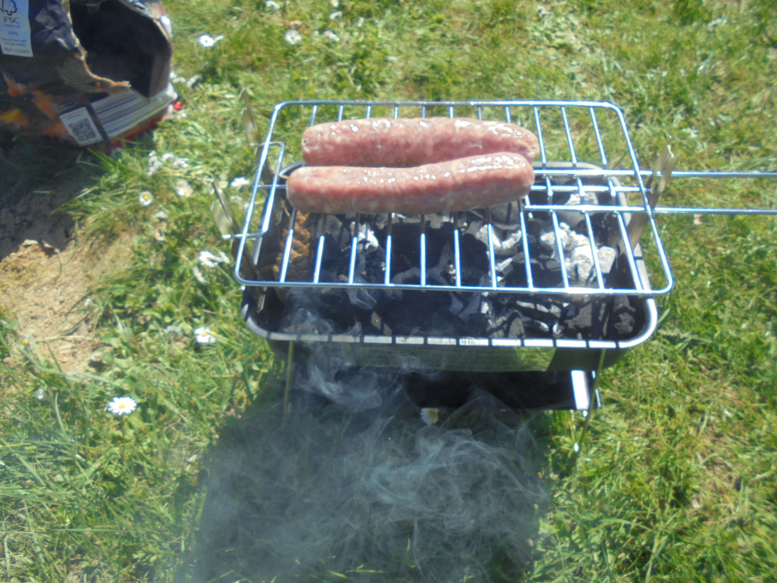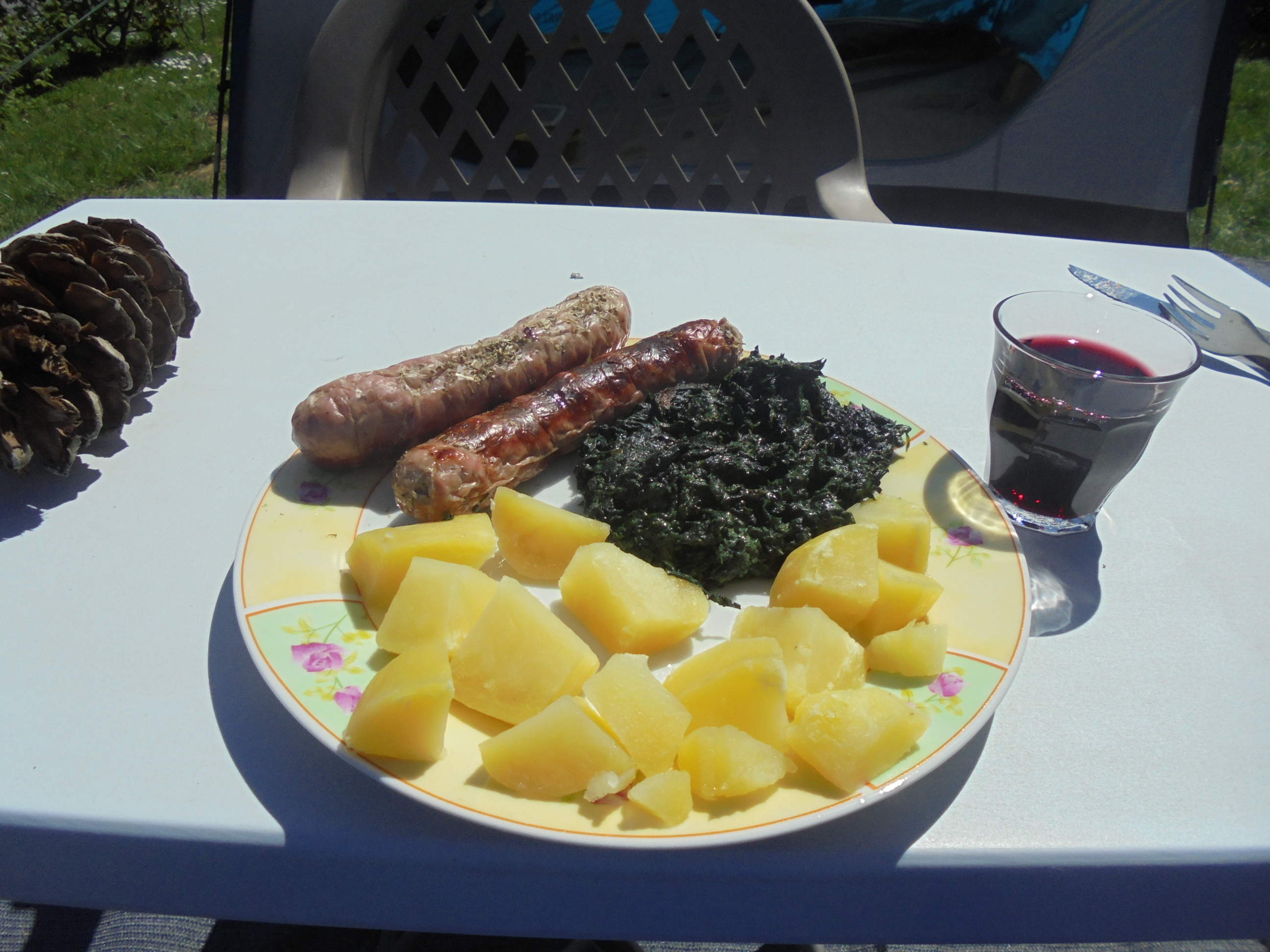 Ensuite, ce midi, Pomme de terre avec une noisette de beurre et avec les orties à la crème cueillie hier avec des saucisses de campagne aux herbes sur le BBQ. Ça au moins, ça change de l'appartement.