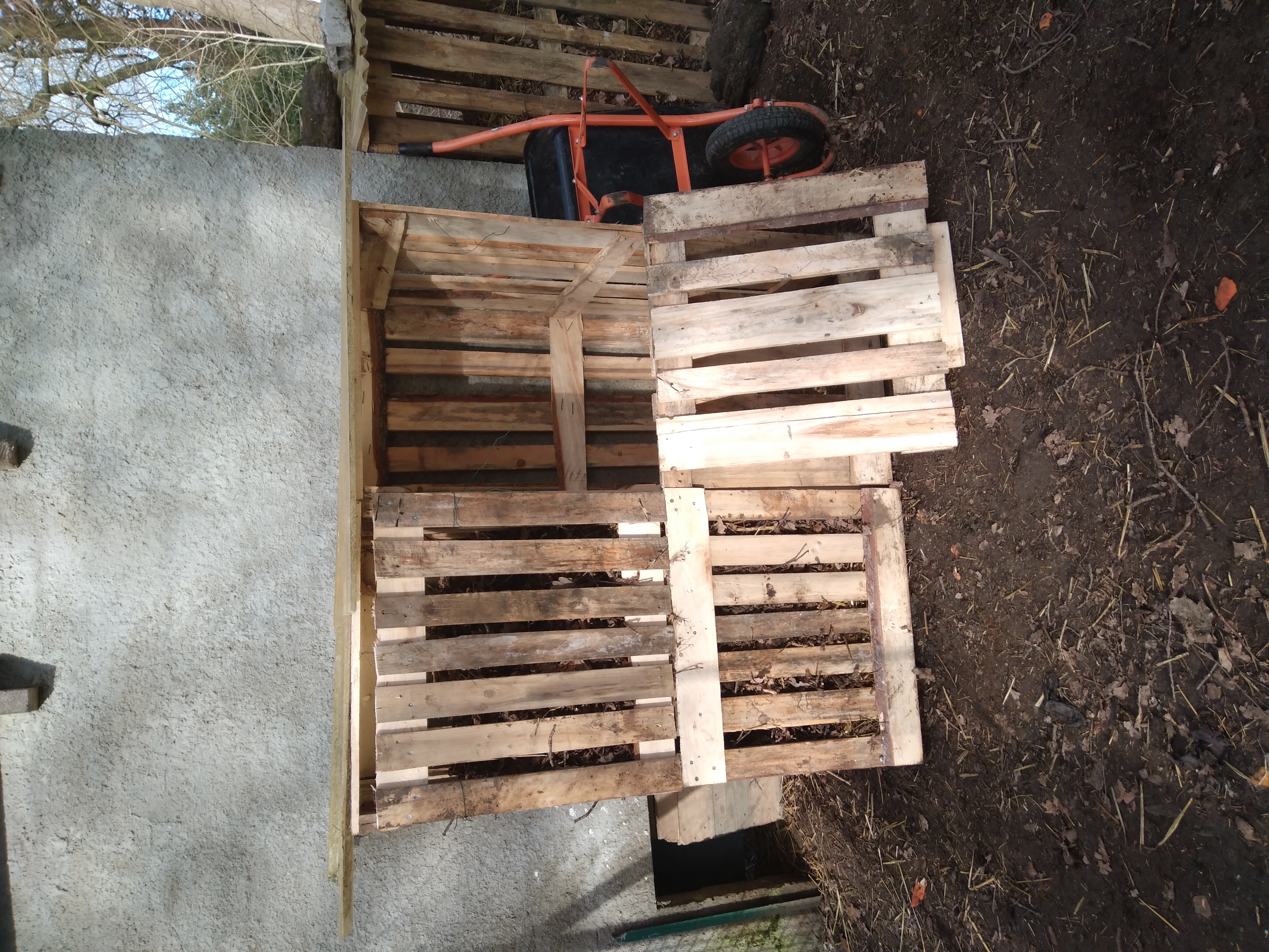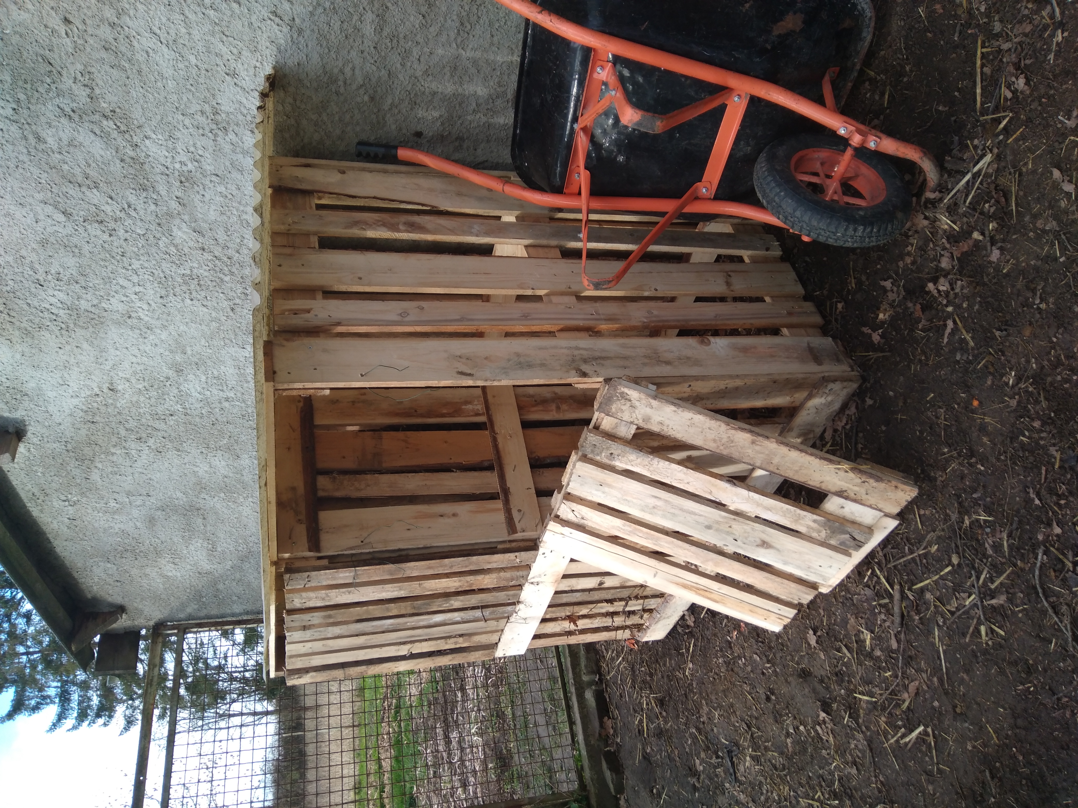 Ensuite, j'ai fais de nouveaux bac à compost avec des palettes que j'ai reçu. Ce matin, ce fut fini et très content de mon travail.