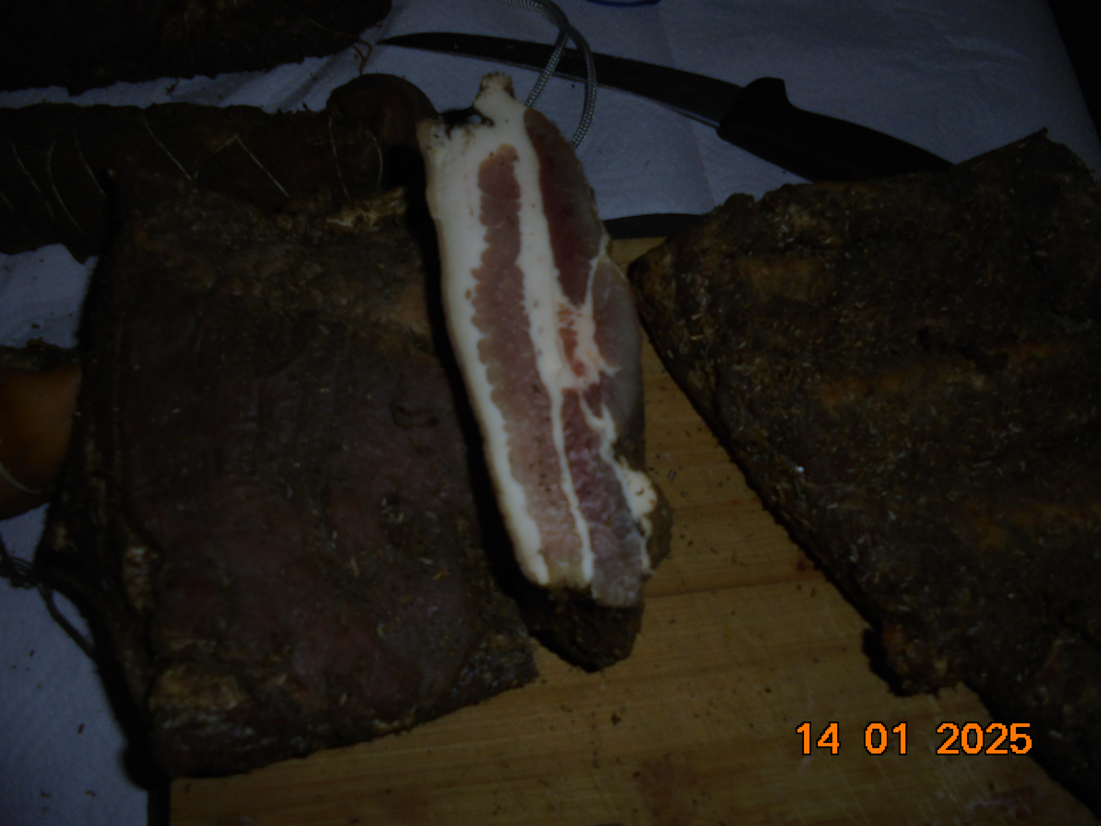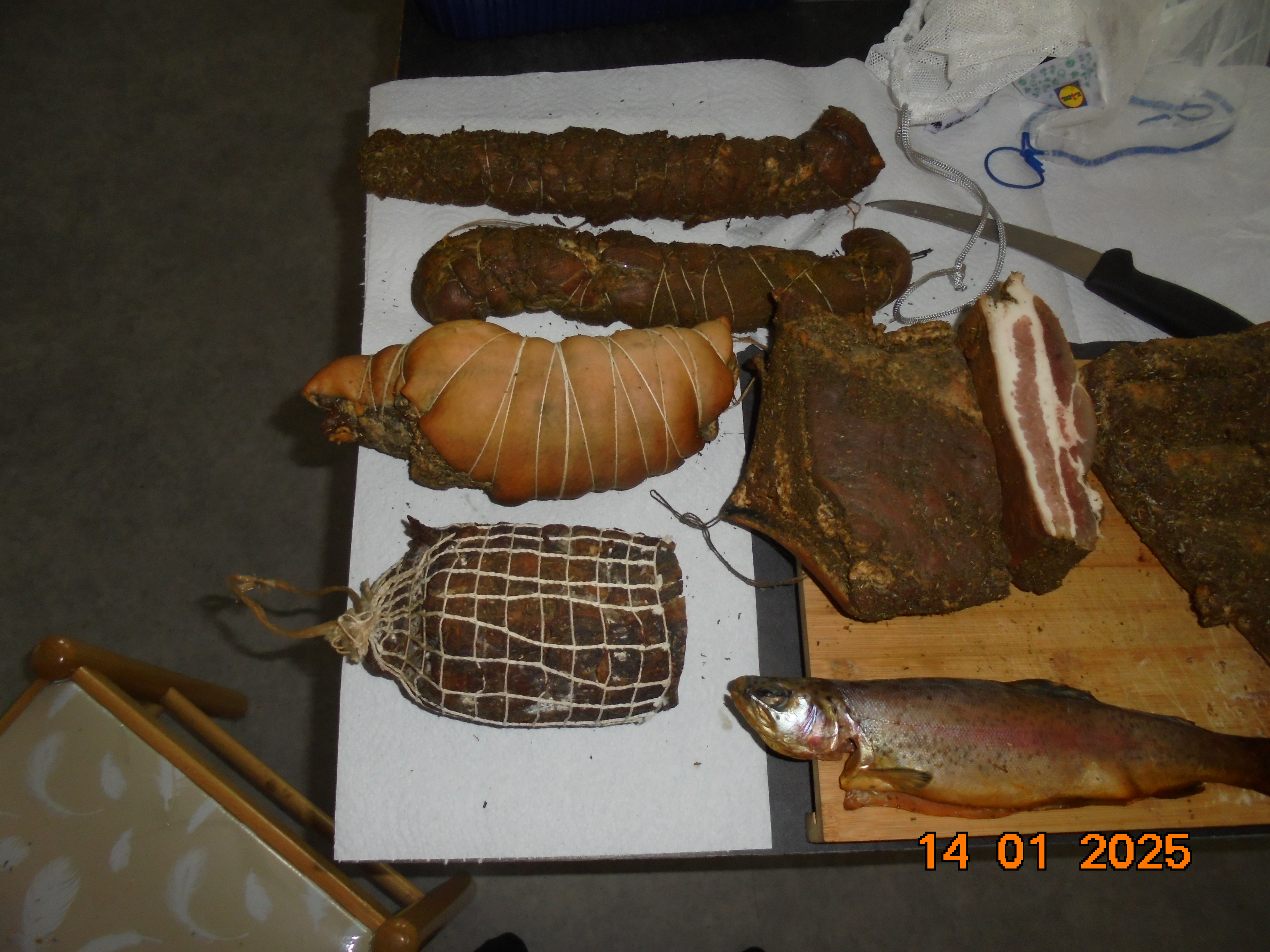 Ce matin,j'ai mis sous vide une partie une partie des viandes que j'ai fumé. C'est à dire, 4 truites fumées, 3kg600 de lard fumé et coupé en tranche. Pour le reste, cça doit encore maturer un peu (deux mois environs) Ensuite, entretien de l'appartement et reppassage de prévu cet après midi.