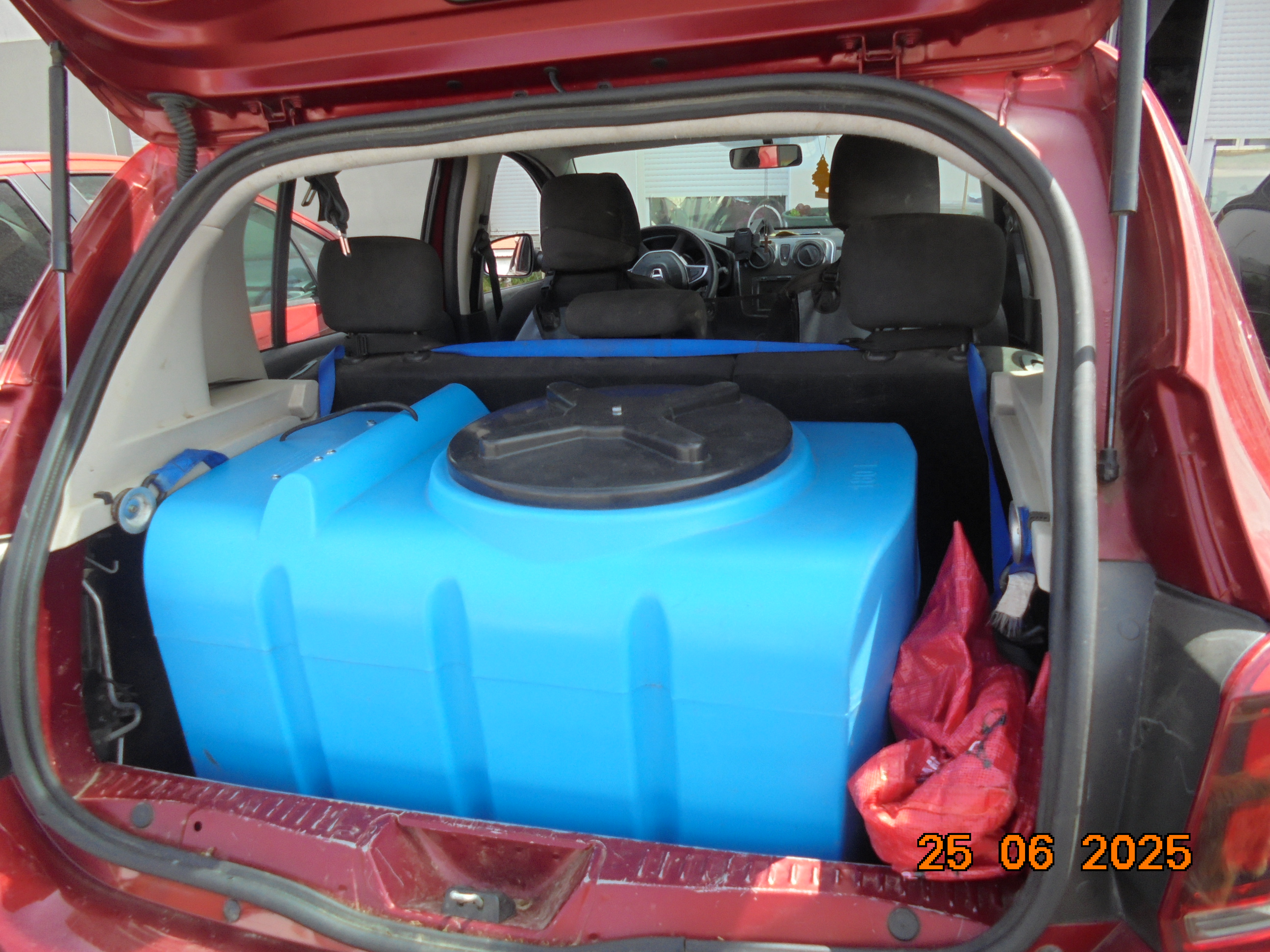Mais, comme chaque jour, je vais chercher à l'étang près de chez-moi de l'eau, deux fois sur la journée et chaque fois 160 litres, cette fois, j'ai acheté une cuve rectangulaire de 180 litres qui va juste dans mon coffre et une pompe avec suppresseurs et 50 m de tuyau, ça va m'aider beaucoup, car avant ça, c'était avec des seaux étanches de 13 litres, donc, pas mal de travail. C'est un coût, mais ça va m'épargner pas mal de soucis.