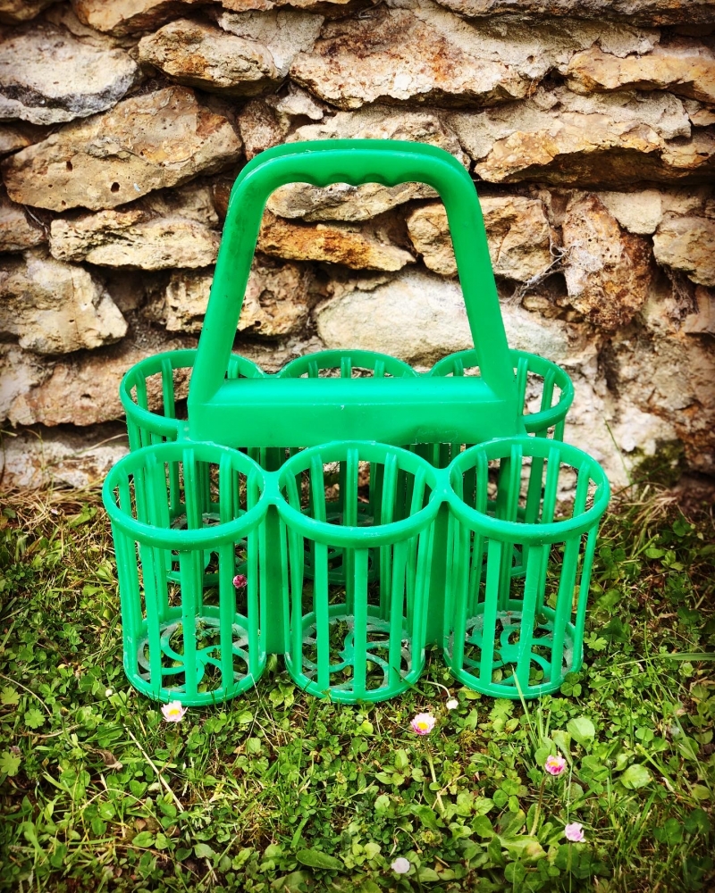 Pour l'huile le vinaigre ou autre condiment liquide un tout bête porte bouteille en plastique dont j'ai coupé l'anse