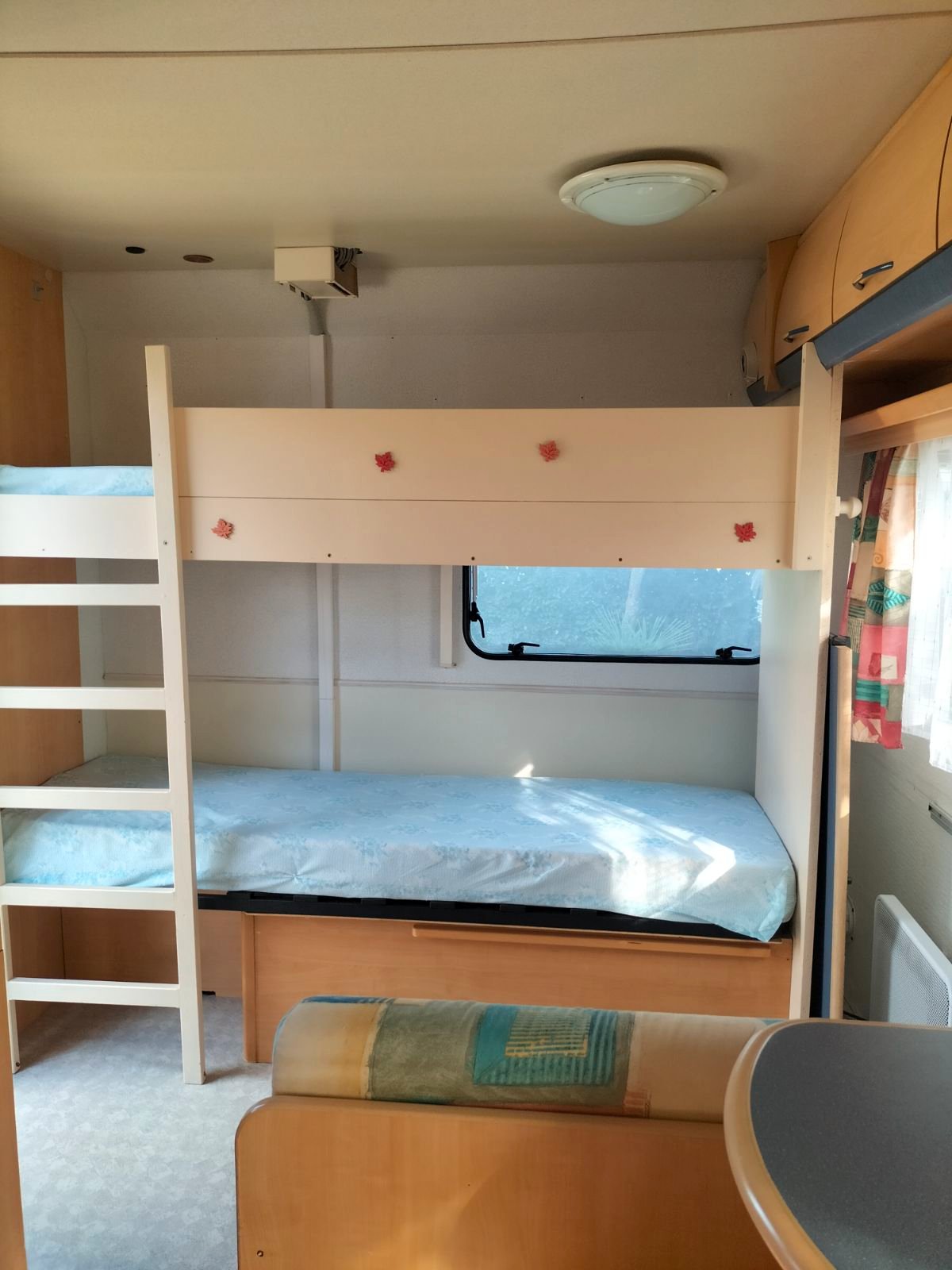 une banquette de la dinette sert aussi de lit, et a un lit superposé au dessus.