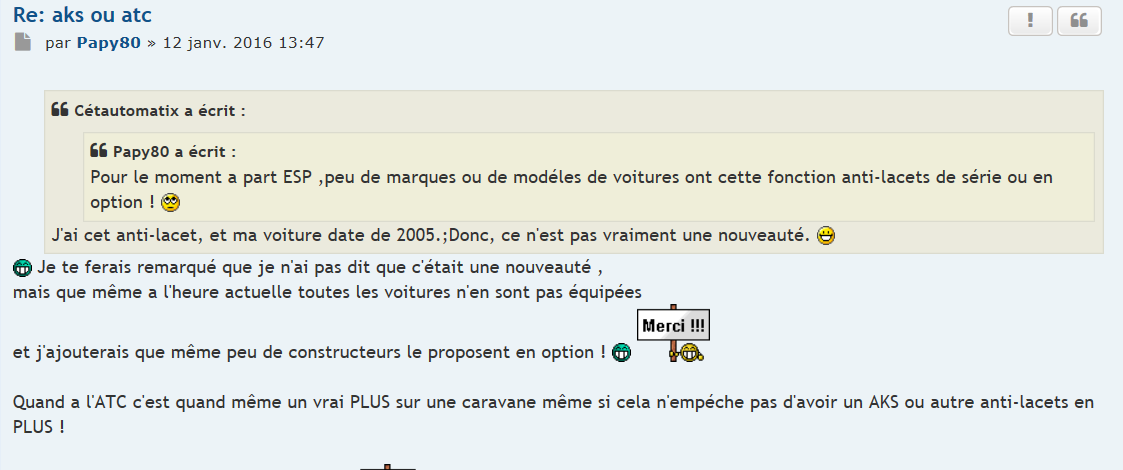 bertone a écrit : ↑28 déc. 2017 14:48Je ne condamne pas systématiquement ces nouveaux systèmes de sécurité...mais ,"thithi"je suis désolé c'est la moindre des choses de savoir analyser la route lorsque l'on tracte une caravane ou autre grosse remorque , conaitre le sens du vent et son intensité!!