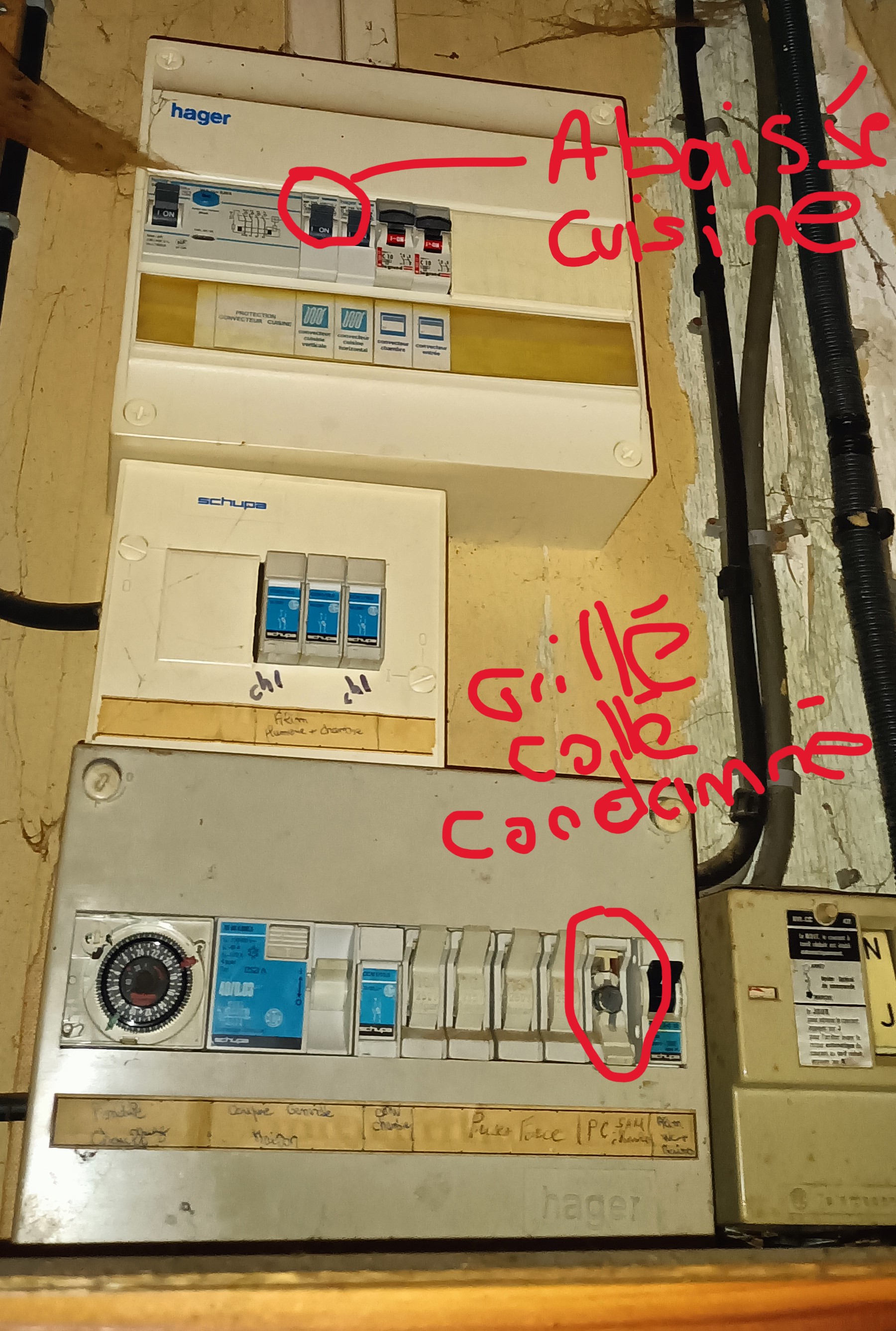 sur les photos, la salle de bain, c'est là où je pense que le fil où j'ai branché la cotûre passe, le 2eme tableau et le lynki sont dans la chambre. sur la partie abaissé du tableau, ça concerne la cuisine. actuellement plus rien n'est branché, dans la pièce j'ai laissé une table, plus aucun équipements de branché ou autres, pourtant, si je remonte l'un ou l'autre ou les 2 le compteur général saute...
