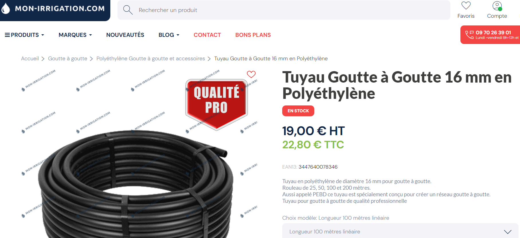 J'ai commandé 100m de tuyau de 16mm car mon point d'eau est très éloigné et ça reviendrai cher en tuyau d'arrosage classique.