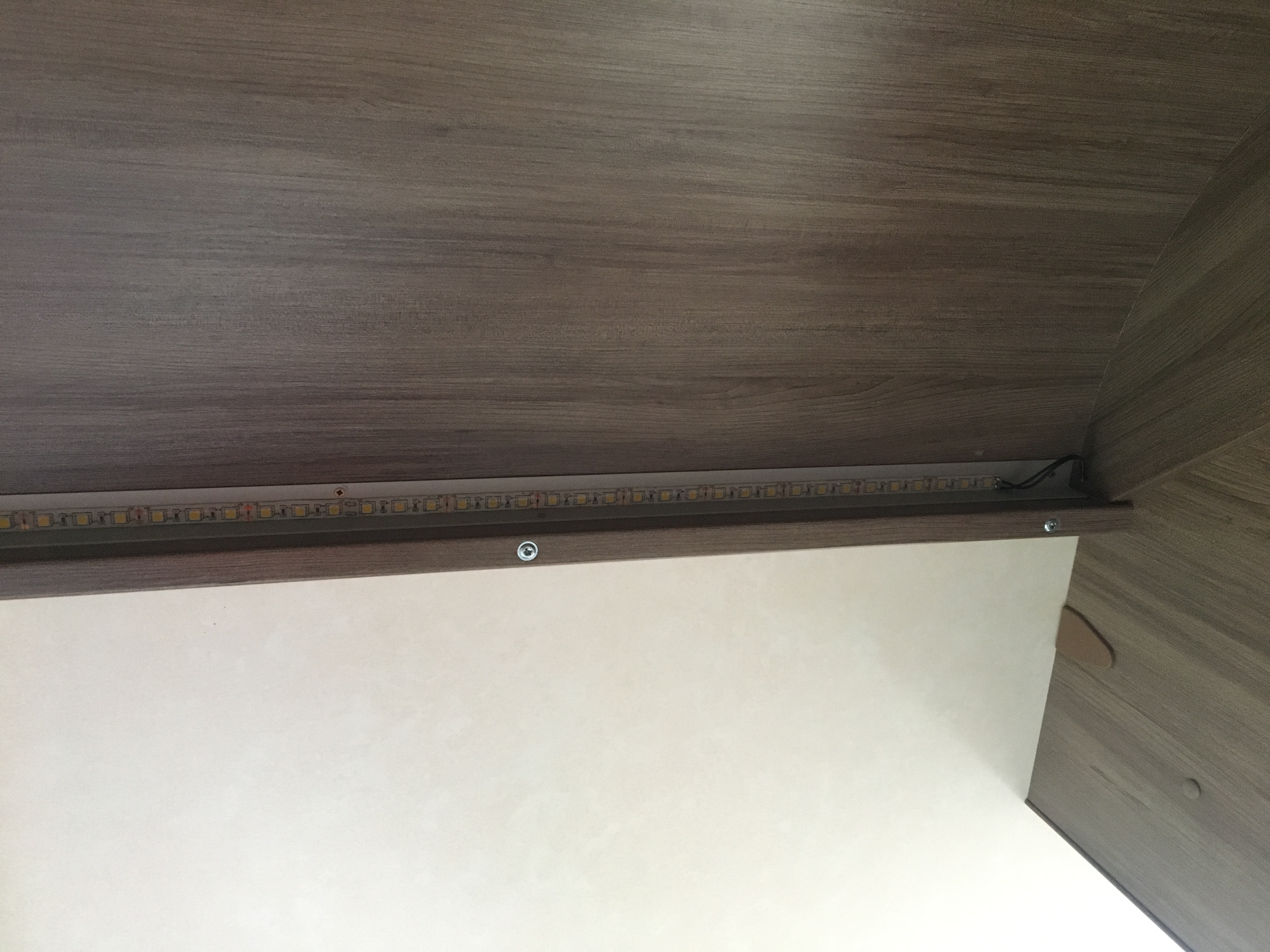 Pour le led, il s'agit de simple ruban led (blanc chaud ou blanc neutre) 12v que j'ai collé sur une cornière alu de 20x20mm. Avant de coller le ruban, j'ai visé la cornière avec trois toutes petites vis. J'avais fraisé l'alu pour que les vis soient à fleur et ne gène pas la pose du ruban.