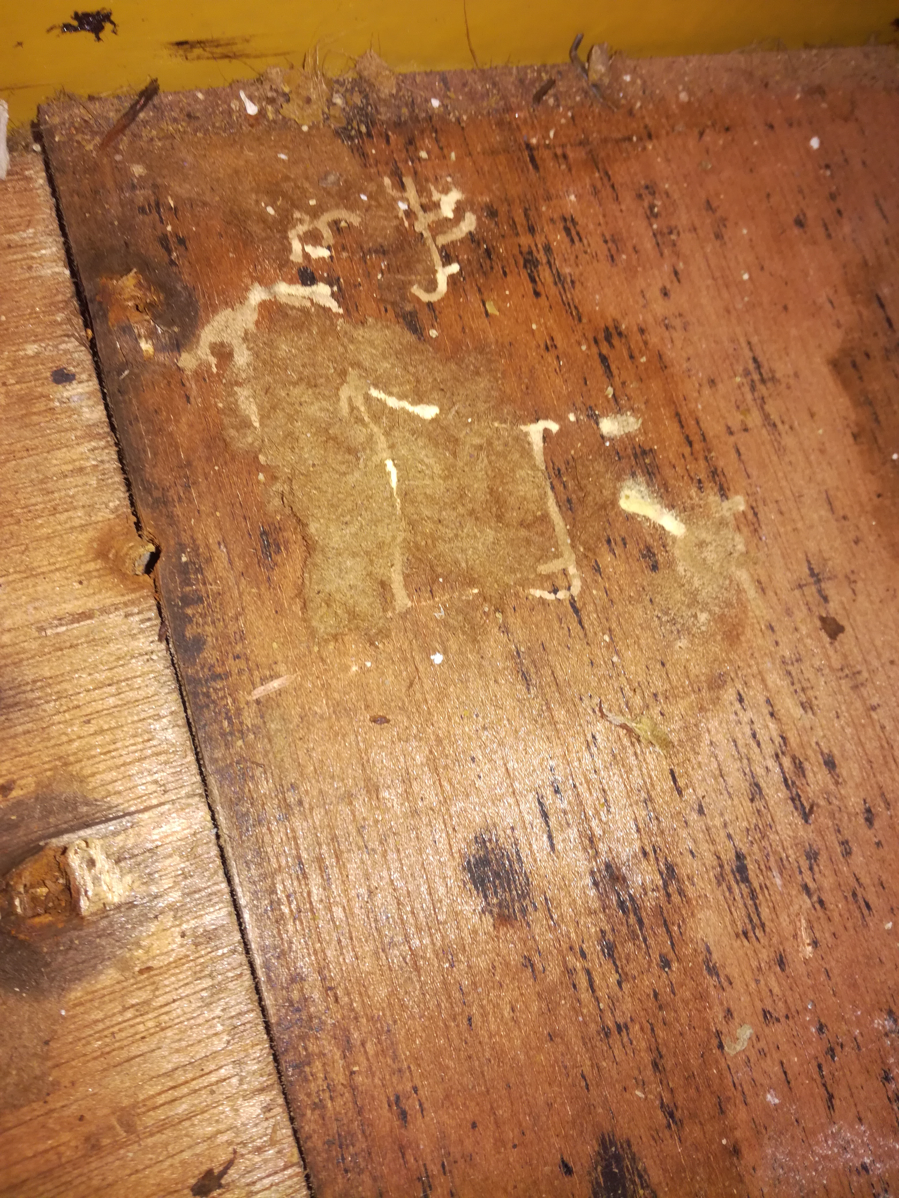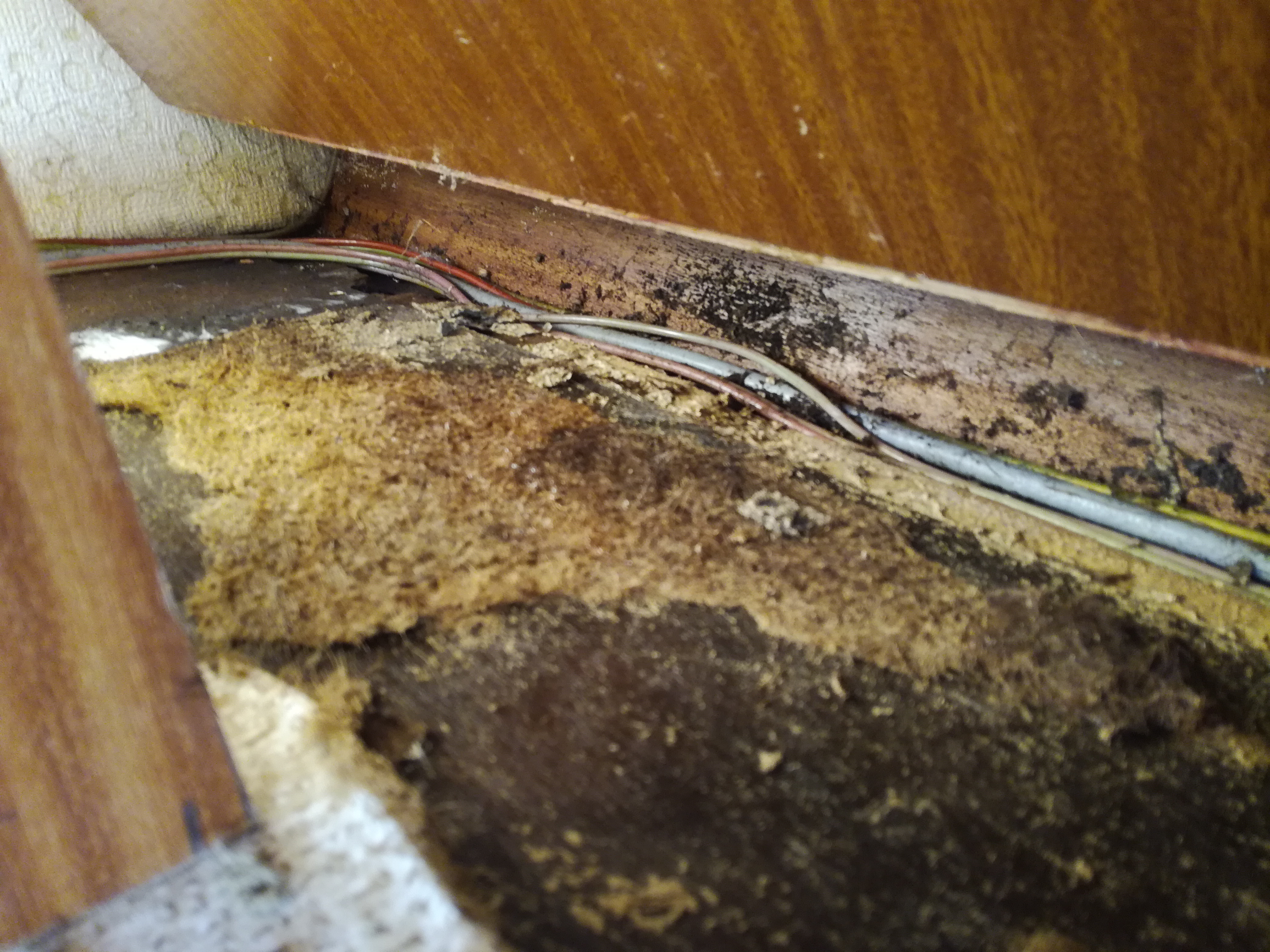 le contreplaqué du dessous n'est pas atteint, au milieu il y a un genre daglo qui lui est imbibé sur les bords et le contreplaqué du dessus parait bon. Nous en saurons plus après avoir entièrement enlevé le lino et mettron les photos ici.
