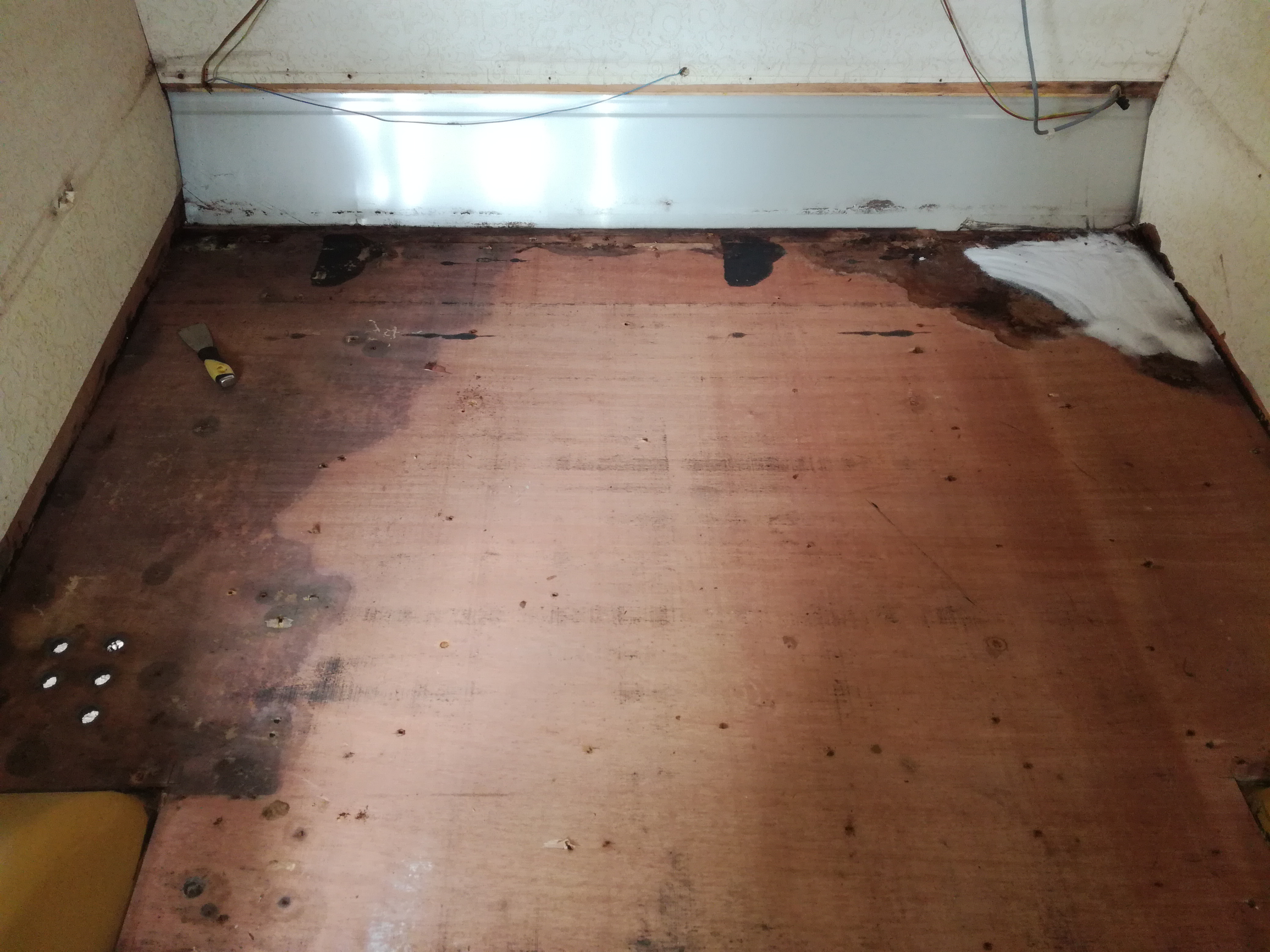 le contreplaqué du dessous n'est pas atteint, au milieu il y a un genre daglo qui lui est imbibé sur les bords et le contreplaqué du dessus parait bon. Nous en saurons plus après avoir entièrement enlevé le lino et mettron les photos ici.