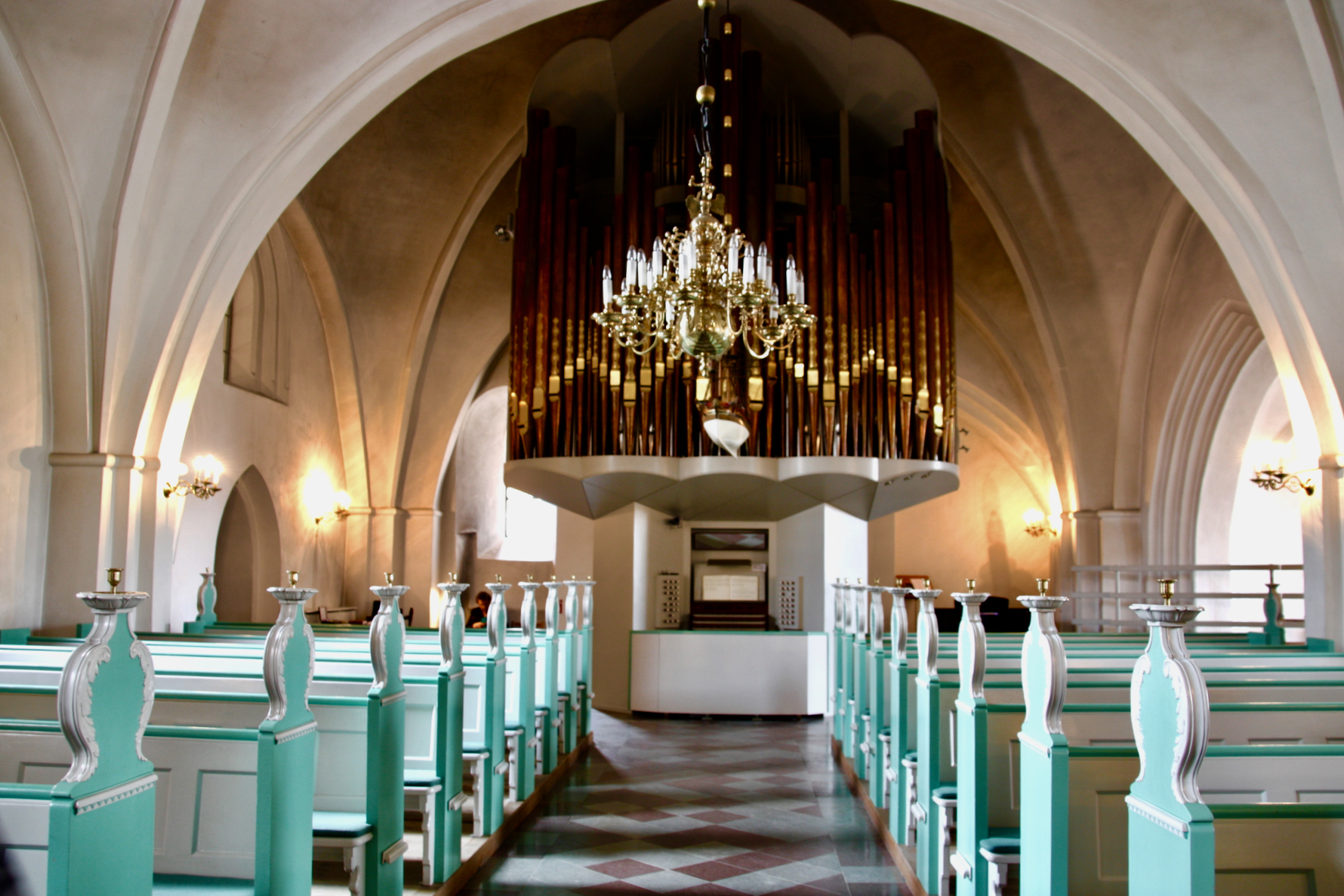 je ne pourrais pas tout remettre, ce serait trop long, ou alors quelques-unes de temps à autre, voici cinq belles églises du Danemark, des églises qui n'ont rien à voir avec les nôtres (même si les nôtres sont très belles) des sièges gais et en couleur, et n'oubliez pas que le Danemark n'est pas si loin que ça, en caravane vous êtes facilement dans le JUTLAND !