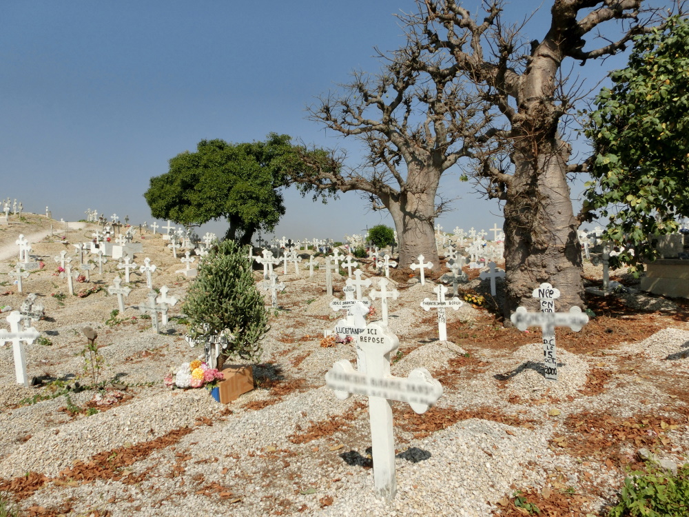 Fadiouth est une minuscule île catholique, située à l'extrémité de la Petite-Côte au sud-est de Dakar. Elle est reliée à la côte par un pont de bois. Son cimetière catholique, avec ses tombes de près de 8 mètres de haut, impressionne par son amoncellement de croix et de coquillages.