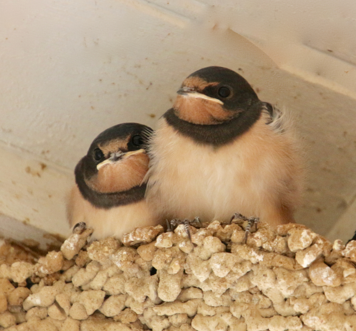 Les hirondeaux ont bien grandi sous mon porche, la maman - la 2e à partir de la gauche- a bien du mal à se faire de la place entre ses 4 petits ! le matin à 8 H elles sont toutes dans le nid, ensuite elles s'envolent toute la journée (balades et nourriture à chercher)