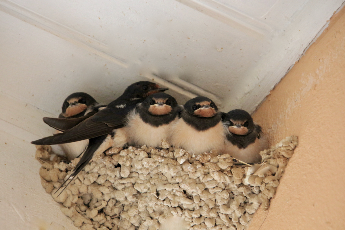 Les hirondeaux ont bien grandi sous mon porche, la maman - la 2e à partir de la gauche- a bien du mal à se faire de la place entre ses 4 petits ! le matin à 8 H elles sont toutes dans le nid, ensuite elles s'envolent toute la journée (balades et nourriture à chercher)