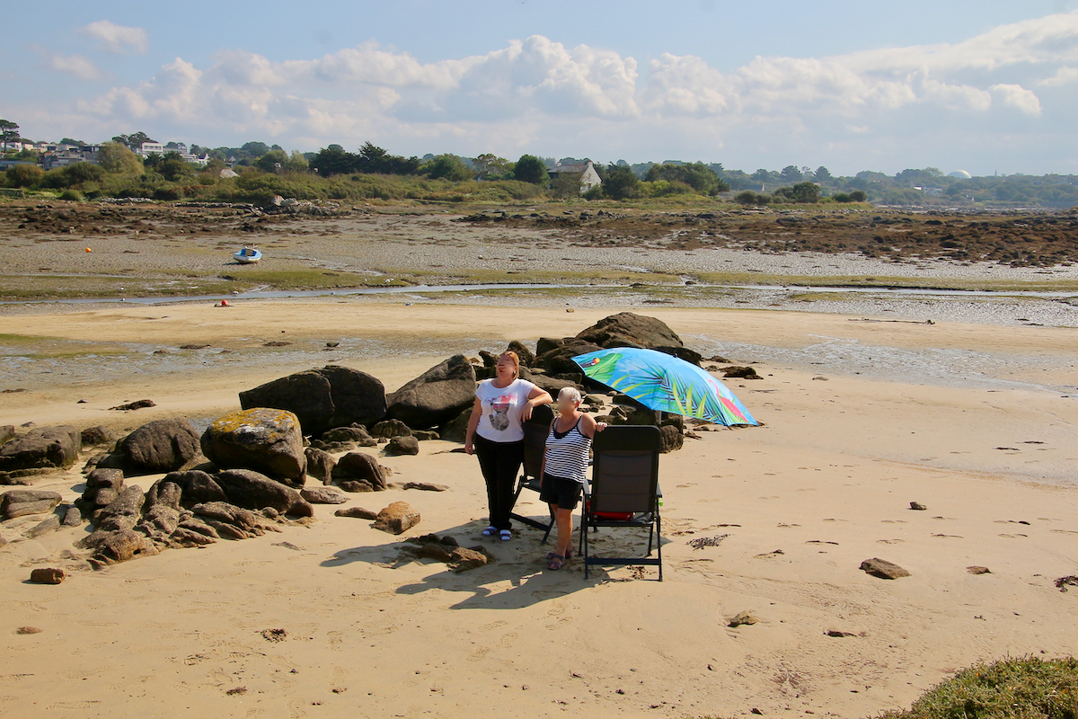 PHOTO 2 : des voisines de camping en train de prendre le soleil sur la plage à marée basse, une rare après-midi de soleil !