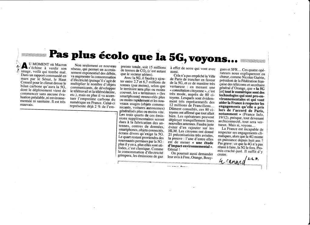 Je voulais vous transmettre une information qui concerne l'ensemble des compteurs connectés et autres sur un article du "Canard Enchaîné" concernant la 5G et vous constaterez que rien n'est fait pour informer la population des dangers réels de l'utilisation de cette technologie qui d'ailleurs ne sert que les Entreprises pour la transmission de leurs informations( Normal) mais ne change rien pour le lambda dans son utilisation de tous les jours.
