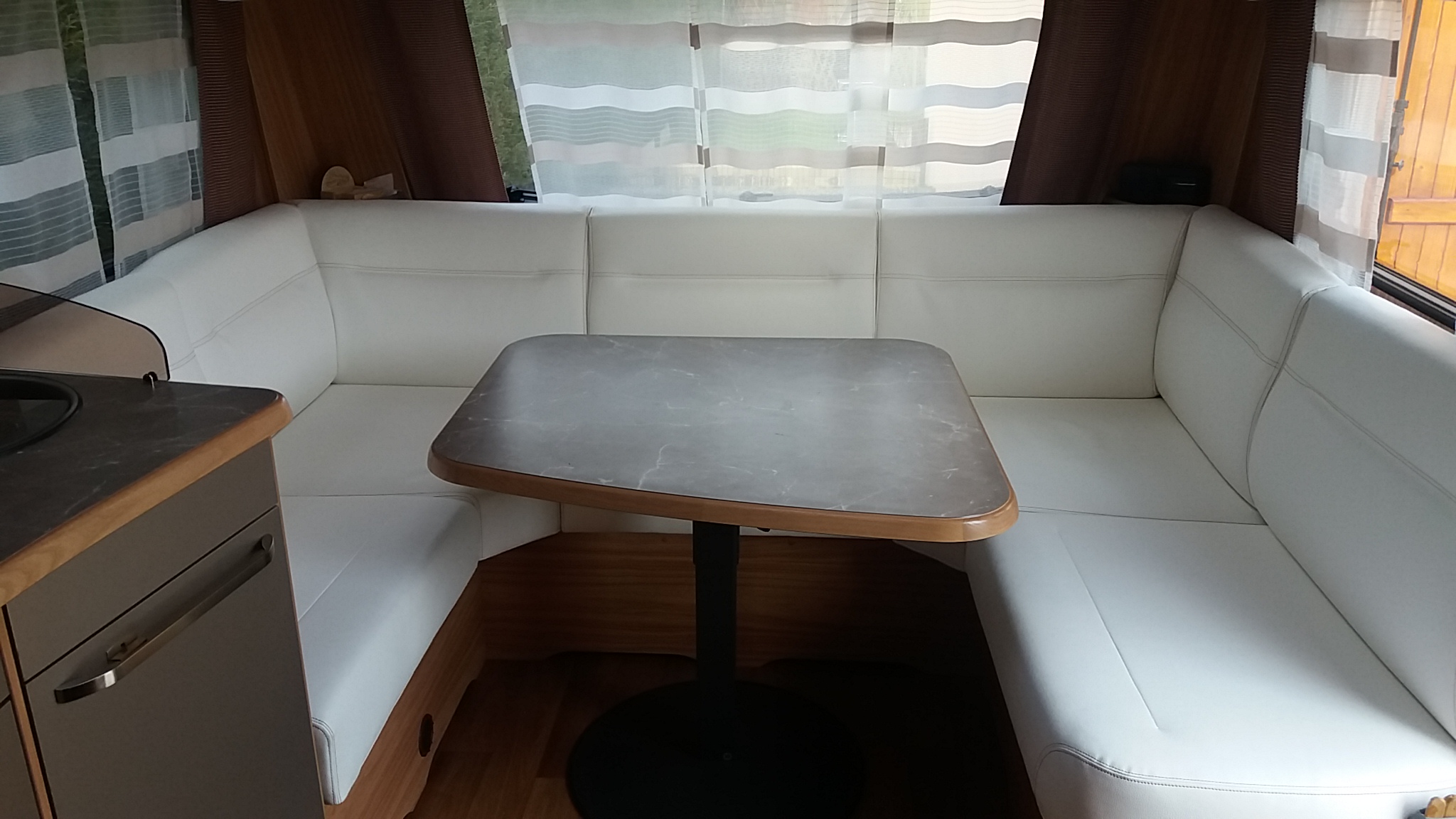 Voila le salon de notre Hymer qui ressemble a bien d'autres petite aparté les assises font 60 cm de profondeur sur tous les coussins une des choses qui est appréciable je n'ai pas plus de photos de l'intérieur