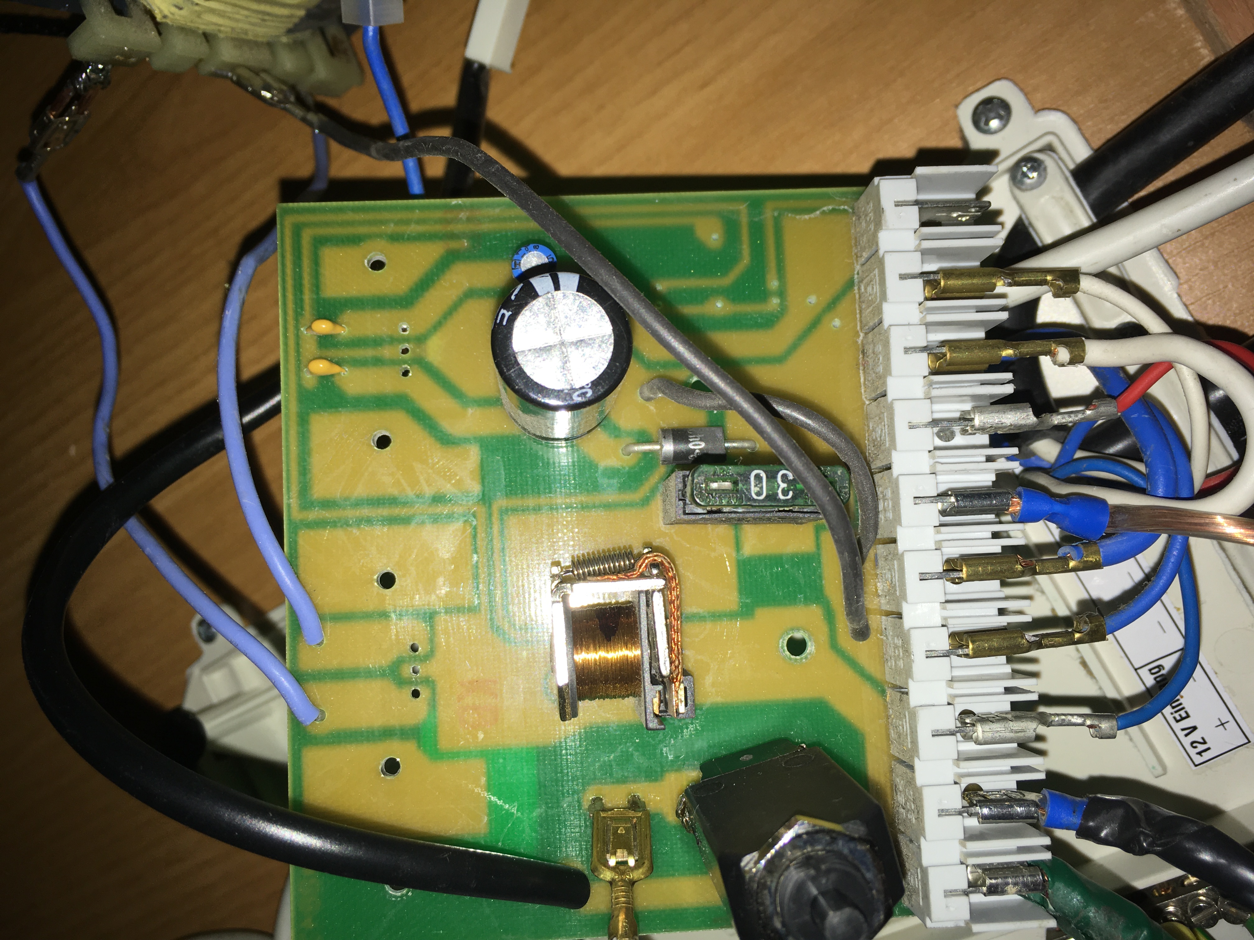 J'ai donc décidé de mettre le nez dans le tableau électrique (photo 1 vue d'ensemble avec le cache qui ne tient pas correctement... et le transfo qui est accroche a cote, je verrais ca plus tard) pour comprendre pourquoi le 12v ne fonctionne pas quand je me branche sur le 220v, et la... catastrophe ! je vois des trous dans le circuit imprimé qui laissent a croire qu'avant il y avait des composants a ces endroits et qu'ils ont disparus (photo 2)