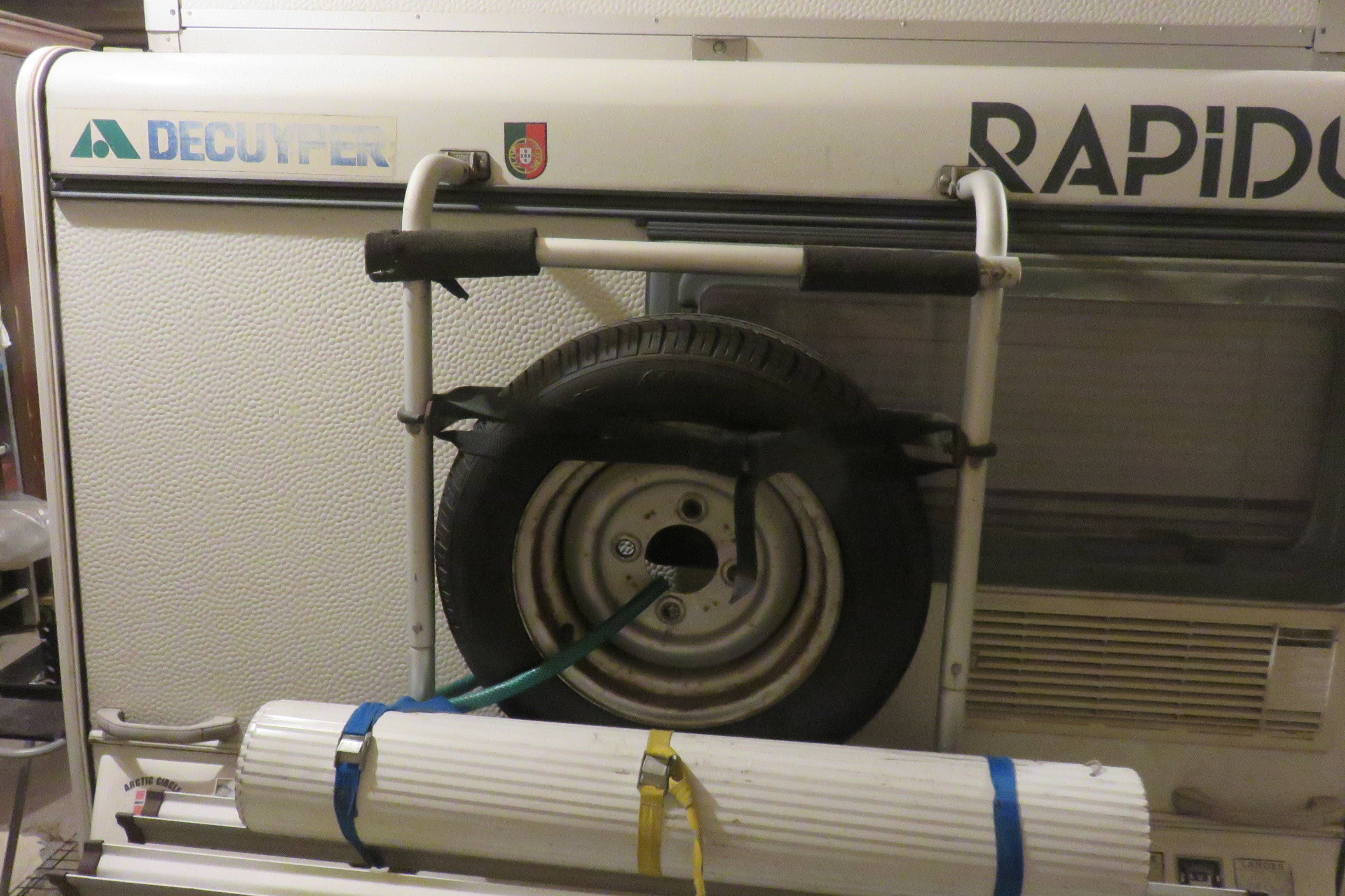 - Soit , quand je ne transporte pas de vélos, la roue de secours sur le porte vélo (Thulé) arrière, avec une petite adaptation faite maison. C'est la solution que je préfère: la roue à tendance à protéger l'arrière de la caravane d'un contact arrière; je rajoute même , au pied de la roue, le pare-vent roulé ( morceau de tôle striée de piscine aérienne) qui nous sert de pare-vent pour la cuisine extérieure, et celà donne à la caravane un petit air baroudeur que j'aime bien et qui est pratique; une chine à cadenas protège symboliquement du vol! Aucun problème de stabilité ni de salissure . Le support vélo à été mis en place (par un concessionnaire sans doute) avec 2 petites contre-plaque côté intérieur, très propre avec cache. Depuis 10ans et 30/40000 km, aucun problème de fiabilité de l'attache (avec 2 vélos ou la roue).