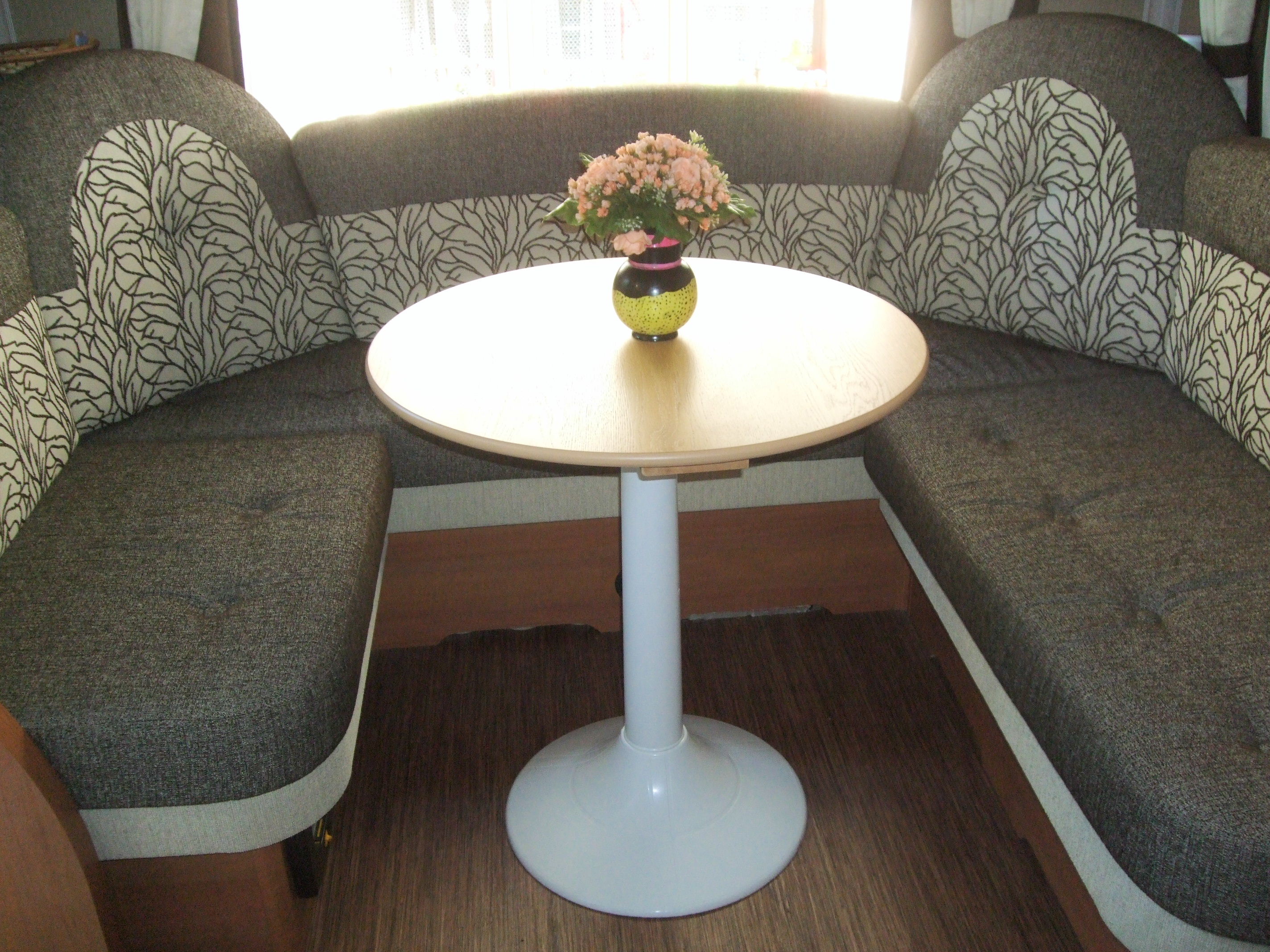 Lorsque j'utilise cette table ronde dans la caravane, j'emmène la table d'origine que j'utilise sous l'auvent comme plan de travail. Mais sinon j'ai aussi des planches en stratifié bien rigides qui pourraient remplacer la table. Et le problème du lit dinette ne se pose pas puisque nous ne sommes que deux dans la caravane.
