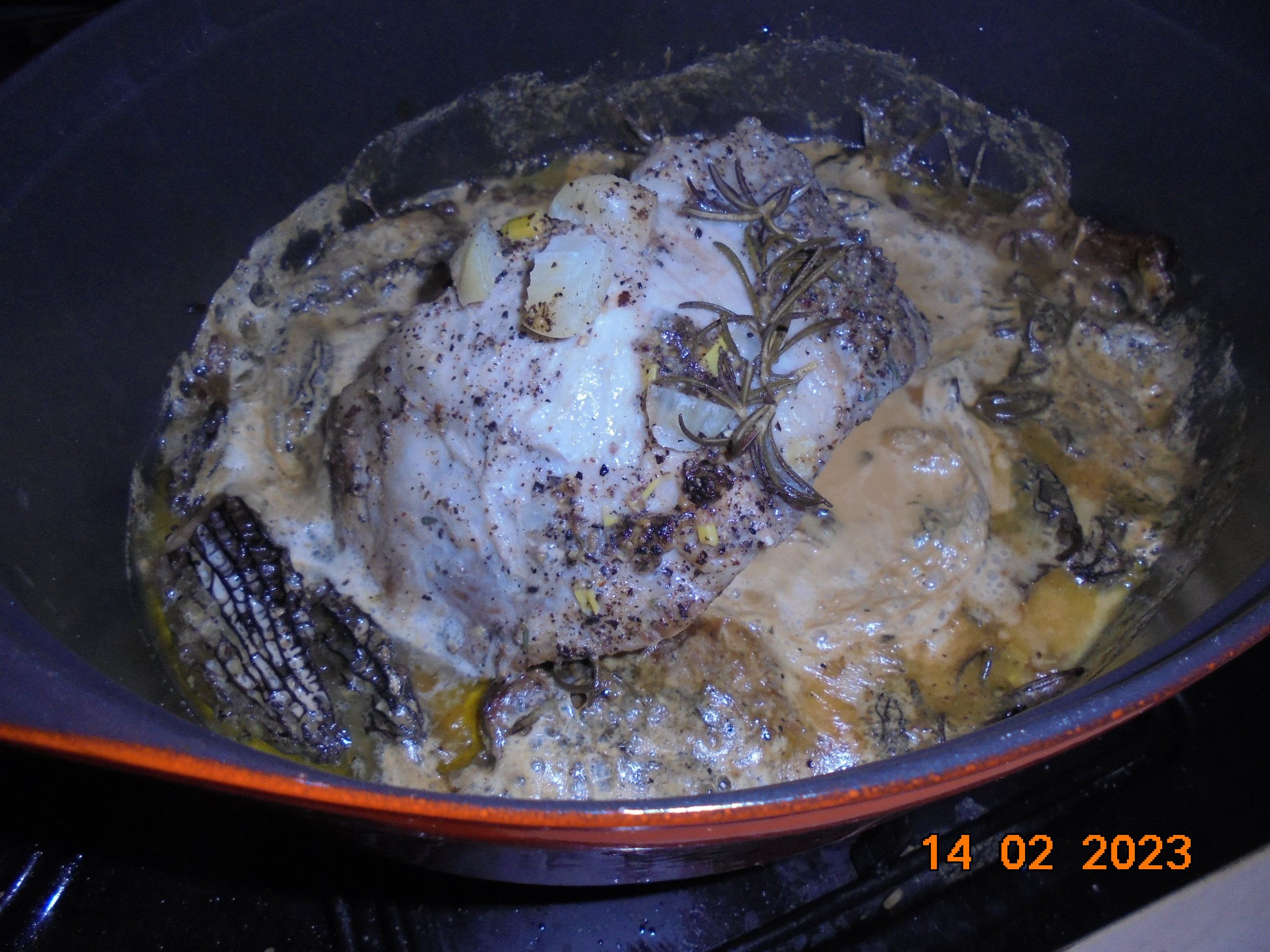 Après l’avoir fait dorer de chaque côté dans la cocote en fonte et avec le l’huile d’olive et du beurre salé, j’y ai ajouté des échalotes, de l’ail, du thym et du romarin.