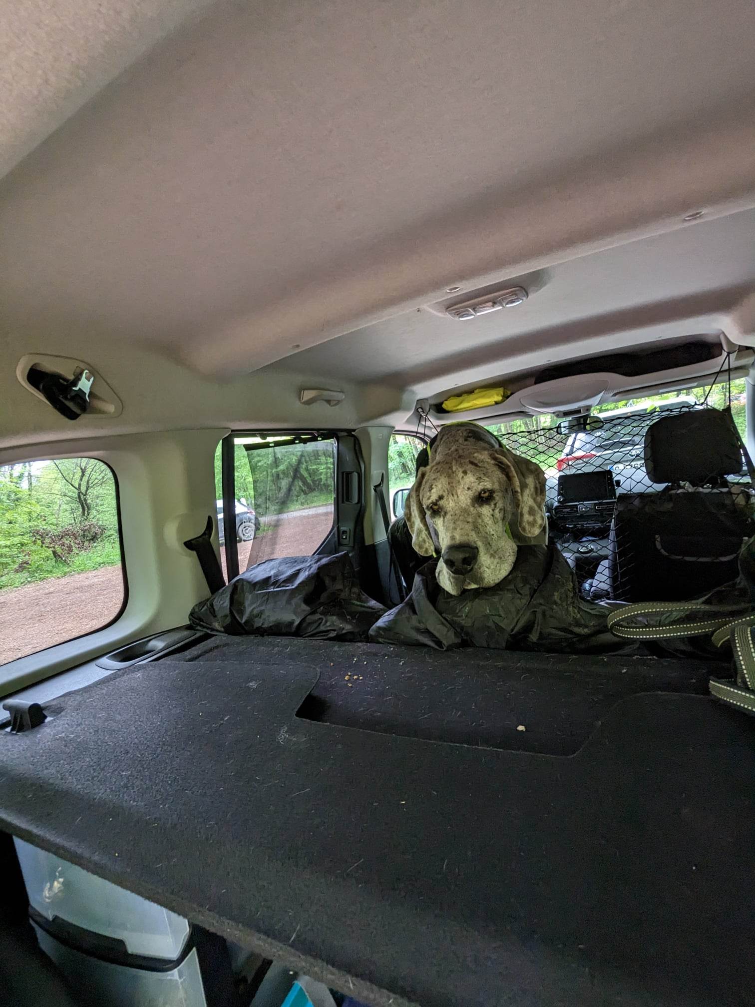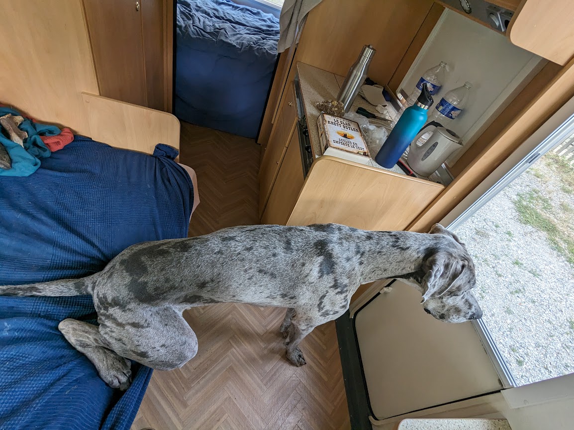 Premier vrai camping pour Lou qui refuse de manger sur le sol de la caravane .... Et qui adore regarder les voisins au soleil :D