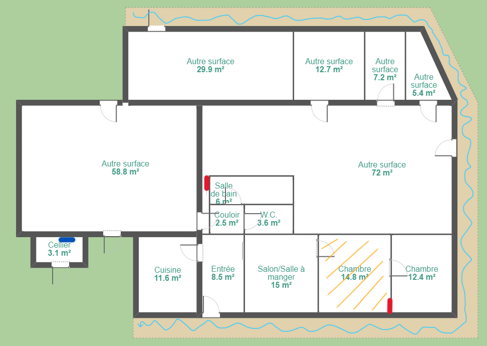 sur le plan, les traits rouges = tableaux électrique, le trait bleu= branchement de la clotûre électrique, trait orange = pièce où je vis actuellement, les traits bleus tout autour, les fameux regards avec l'eau