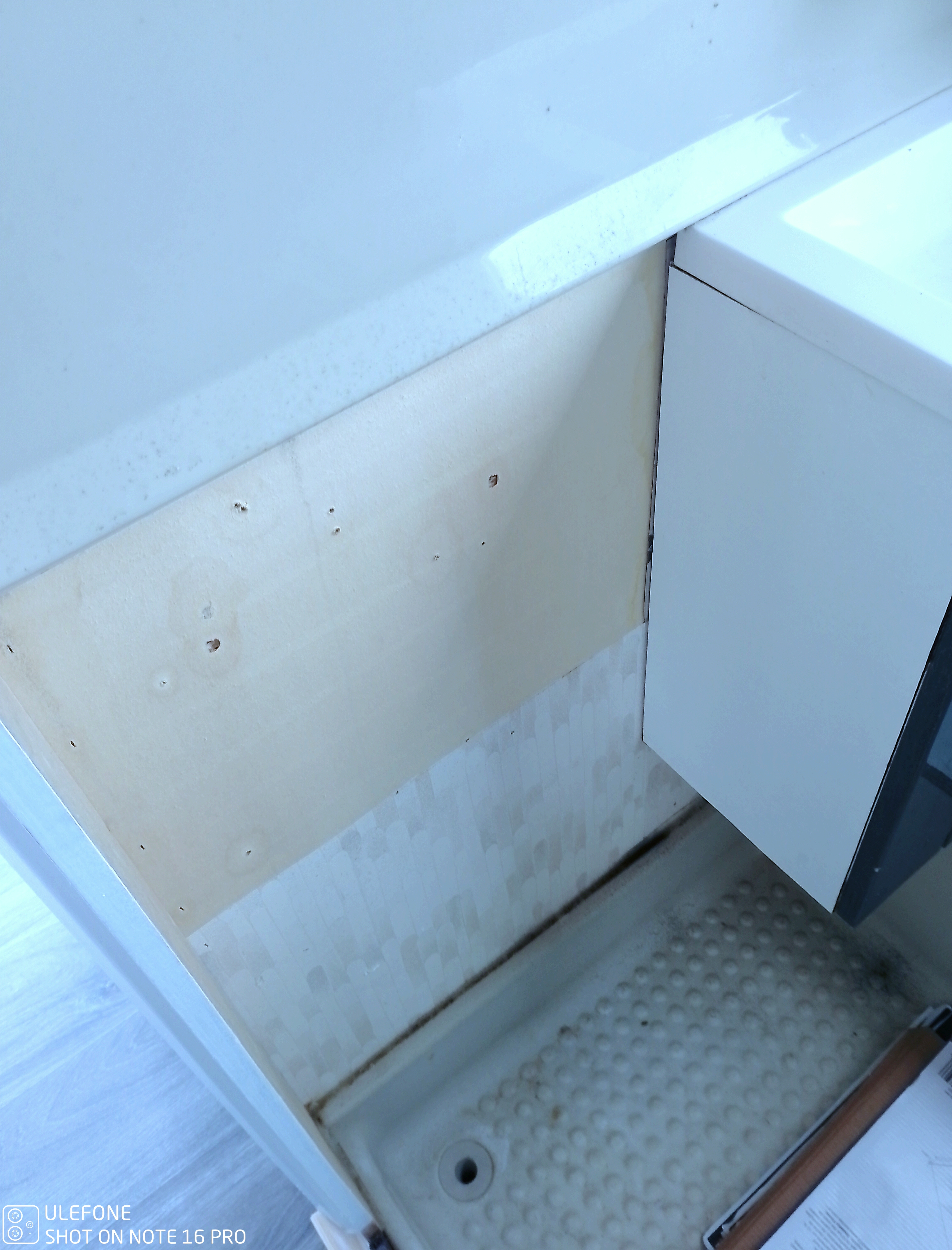 Papier peint dégradé, bac à douche jauni, sec et fissuré dans les angles.