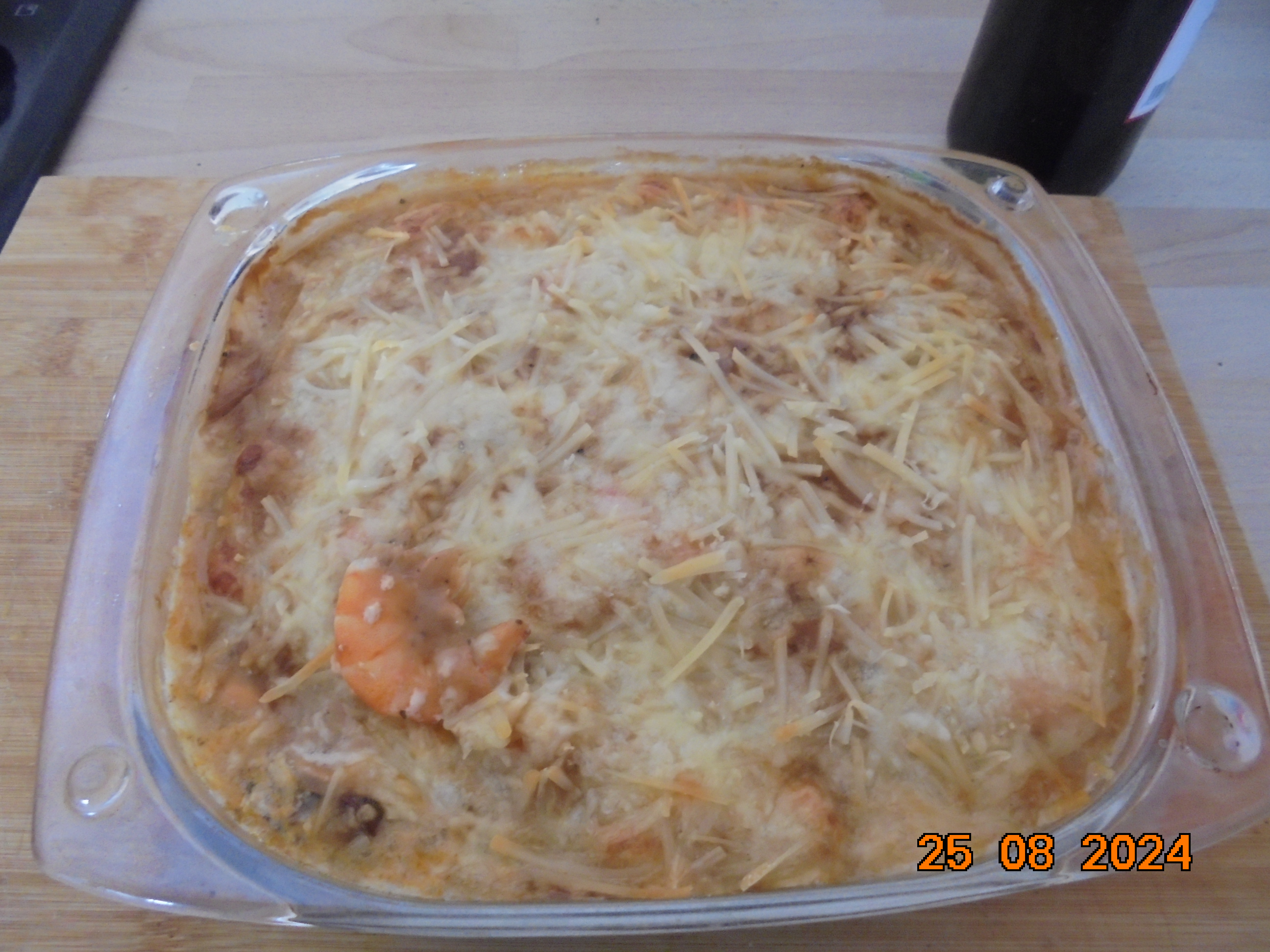 Un peu de béchamel et j’y dépose les moules, un peu de béchamel et j’y dépose des crevettes, les grises sont meilleurs, mais les roses ne sont pas mauvaises. Je couvre avec le reste de béchamel et je parsème généreusement du fromage râpé, ma préférence vas vers le Comté (un fromage de cœur)