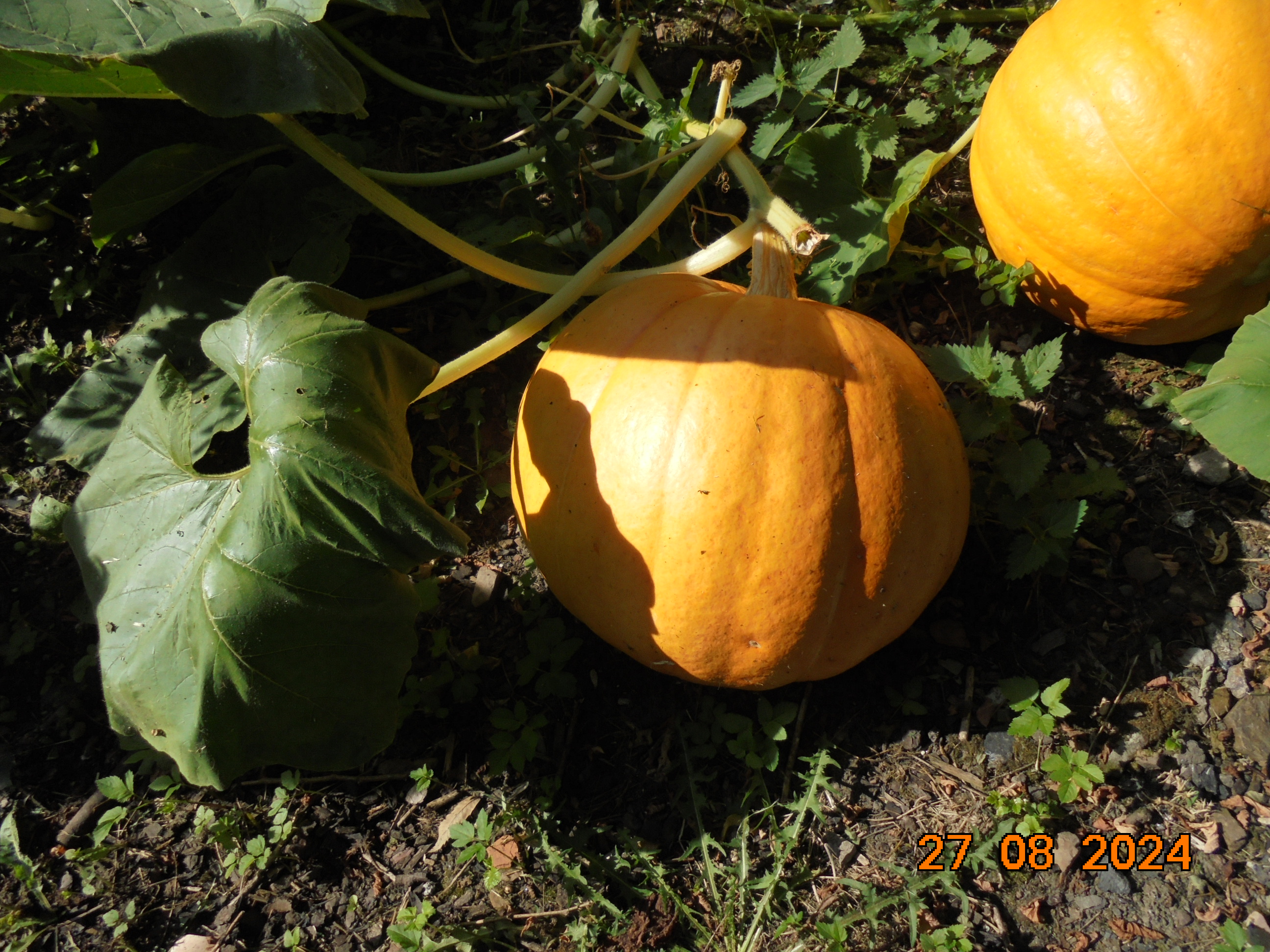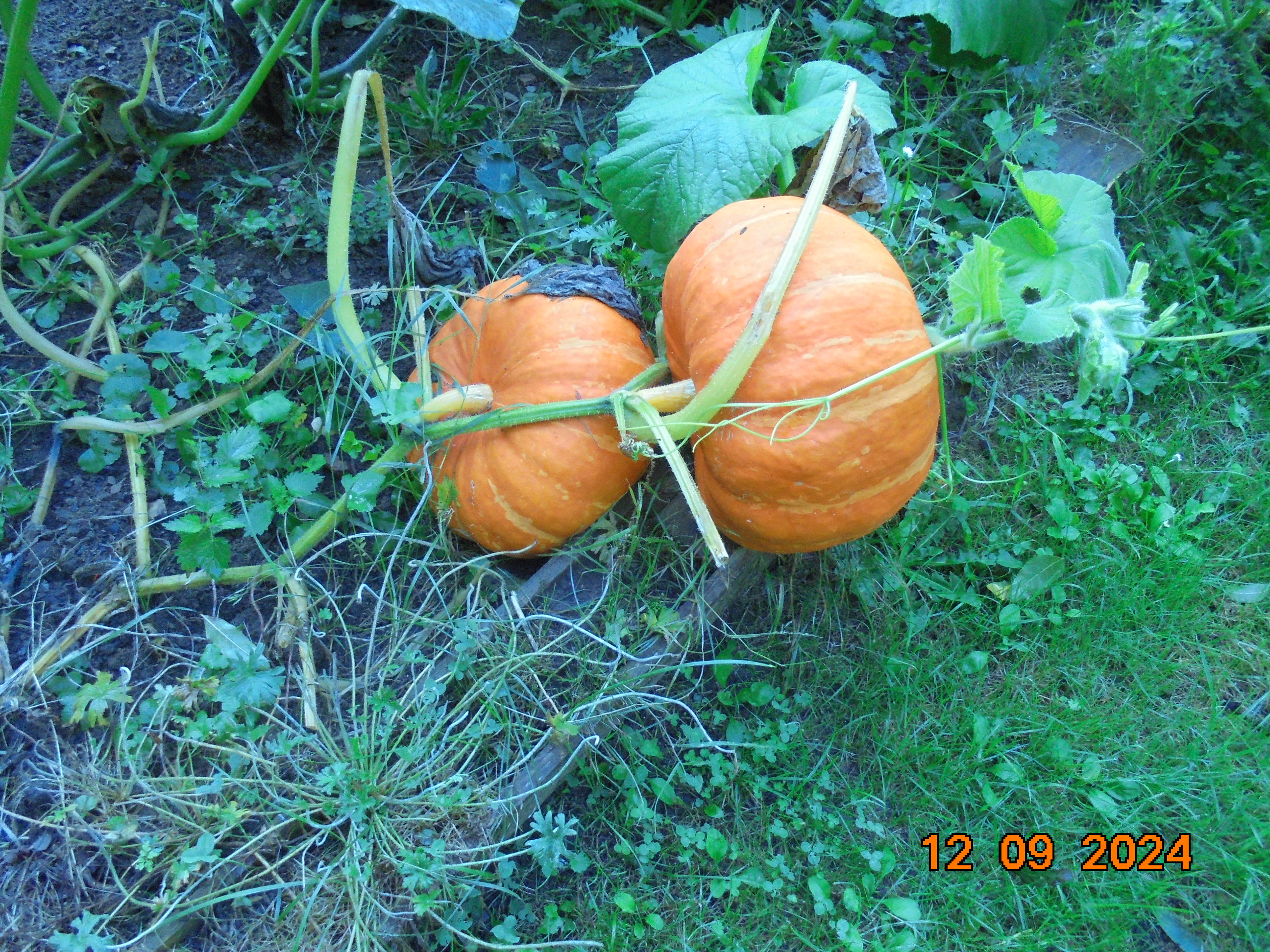 Voici une partie de ma récolte, le plus gros potiron fait 56 kg et l'autre fait 47,5 kg, mais j'en ai déjà donné la semaine passée, surtout des courges spaghetti.