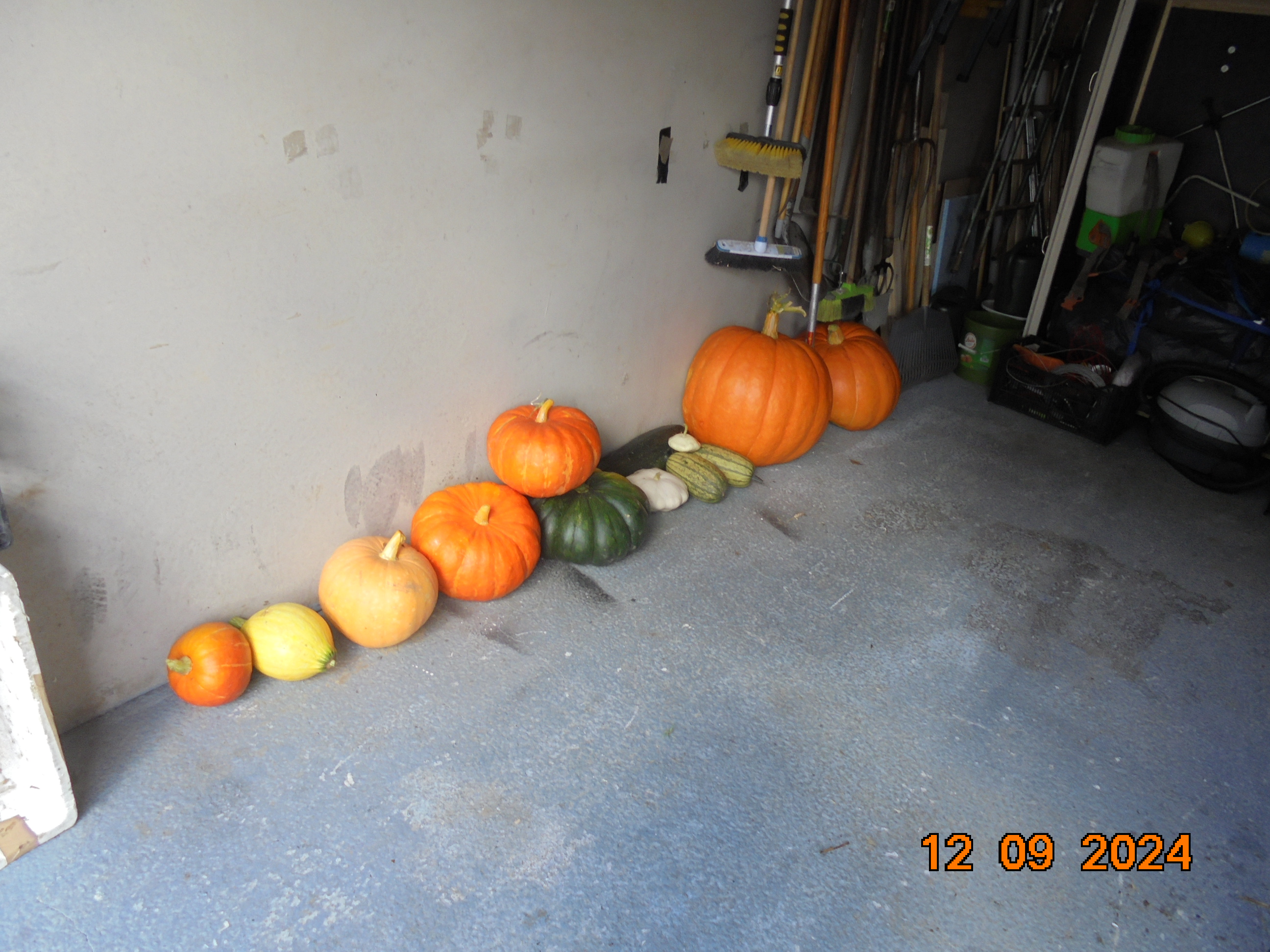 Voici une partie de ma récolte, le plus gros potiron fait 56 kg et l'autre fait 47,5 kg, mais j'en ai déjà donné la semaine passée, surtout des courges spaghetti.