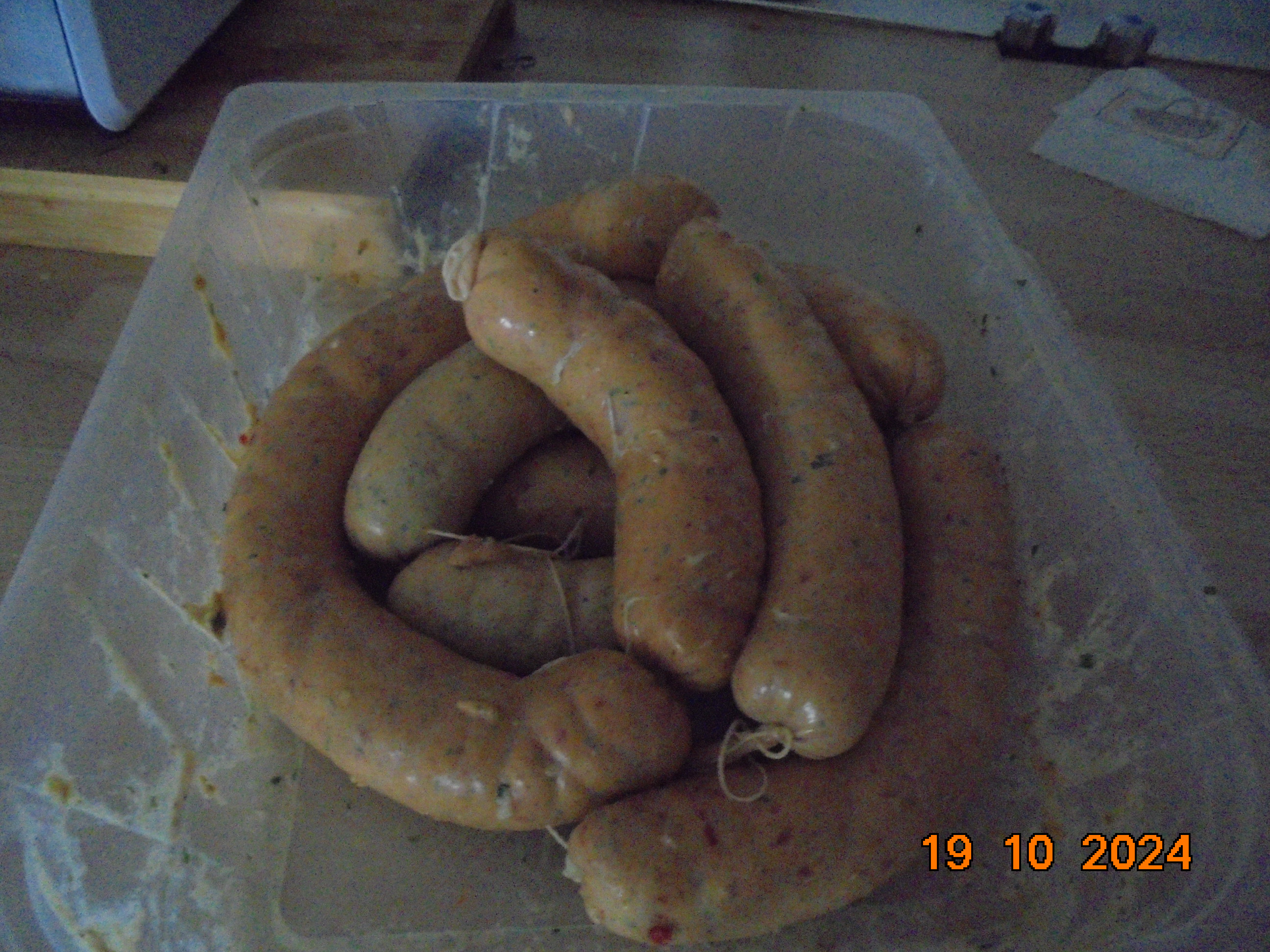 Hier, chez mon fils, avec la viande, le fromage, les poivrons, échalotes et ail, nous avons fait 13 kg de saucisses.