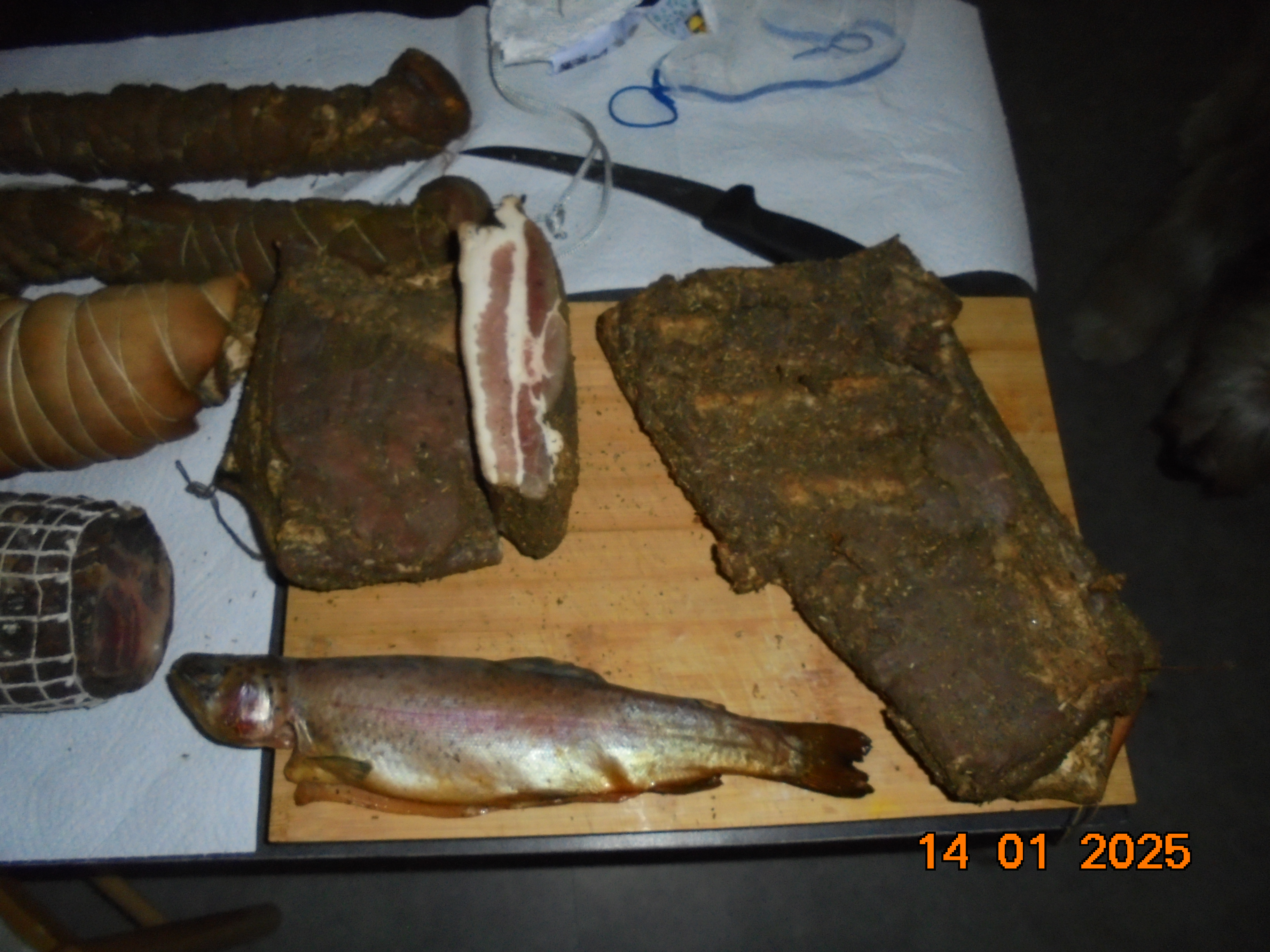 Ce matin,j'ai mis sous vide une partie une partie des viandes que j'ai fumé. C'est à dire, 4 truites fumées, 3kg600 de lard fumé et coupé en tranche. Pour le reste, cça doit encore maturer un peu (deux mois environs) Ensuite, entretien de l'appartement et reppassage de prévu cet après midi.