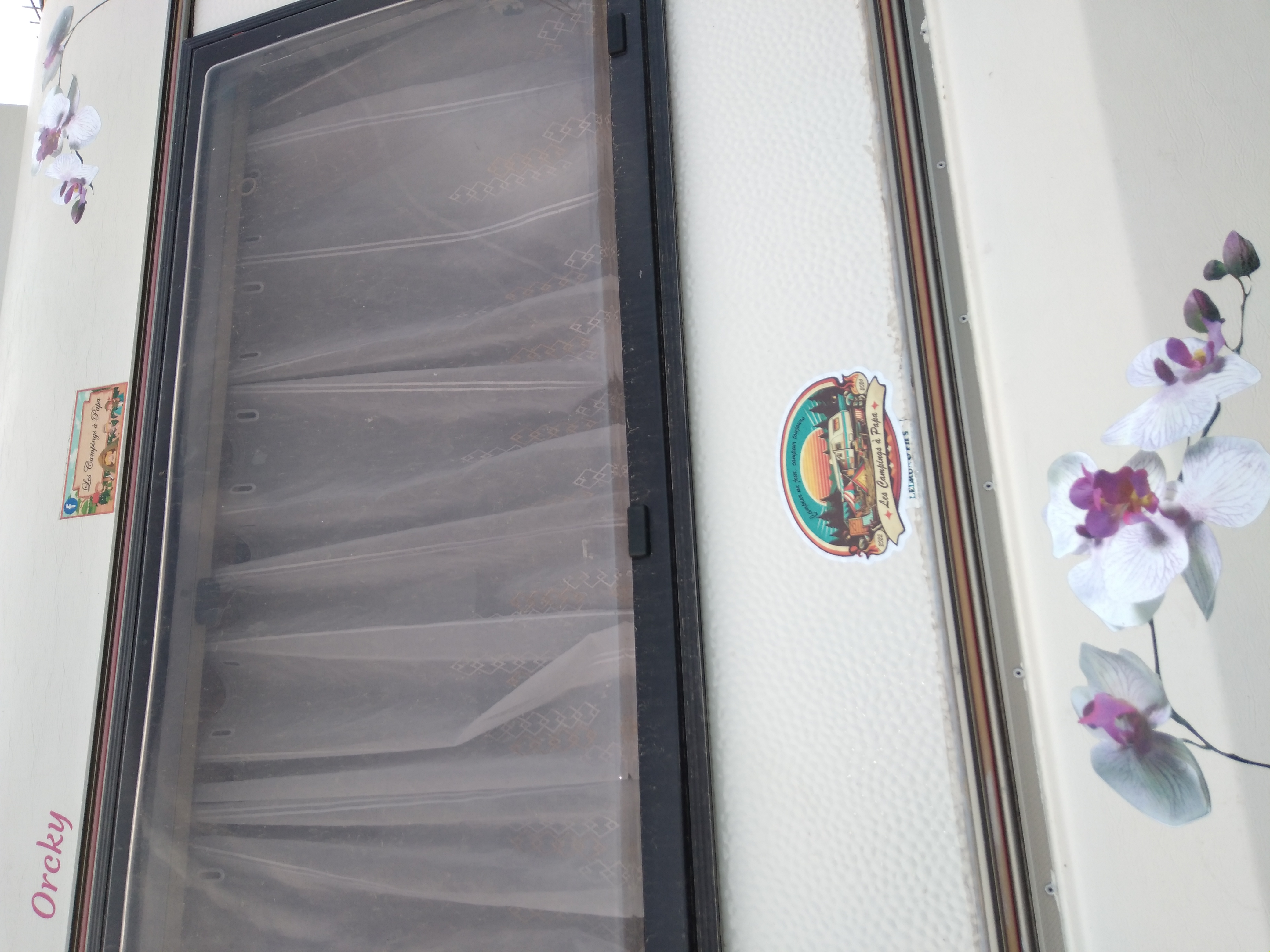 Défaut constaté, quelques petit pok sur le côté droit, mais rien de méchant. Baie avant, double vitrage, celle-ci est fêlée sur l'intérieur, la vitre extérieure n'a rien et n'occasionne pas de fuite.