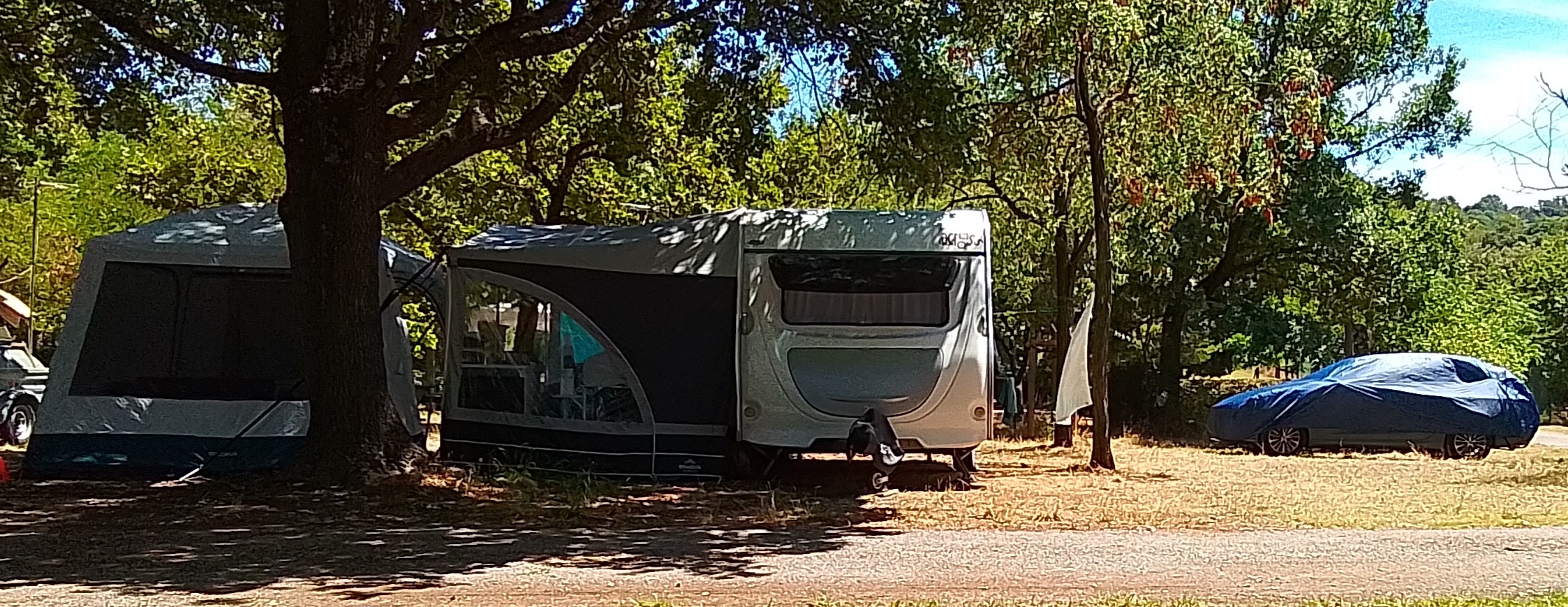 Comme je l'ai déjà écrit sur le forum, nous sommes des caravaniers qui aiment bien bouger et s'installer rapidement. Pour le moment, nous n'avons pas de store ni d'auvent et simplement une solette que nous sortons quand nous n'avons pas d'autre choix, c'est à dire pour avoir un peu d'ombre ou pour protéger de la pluie.