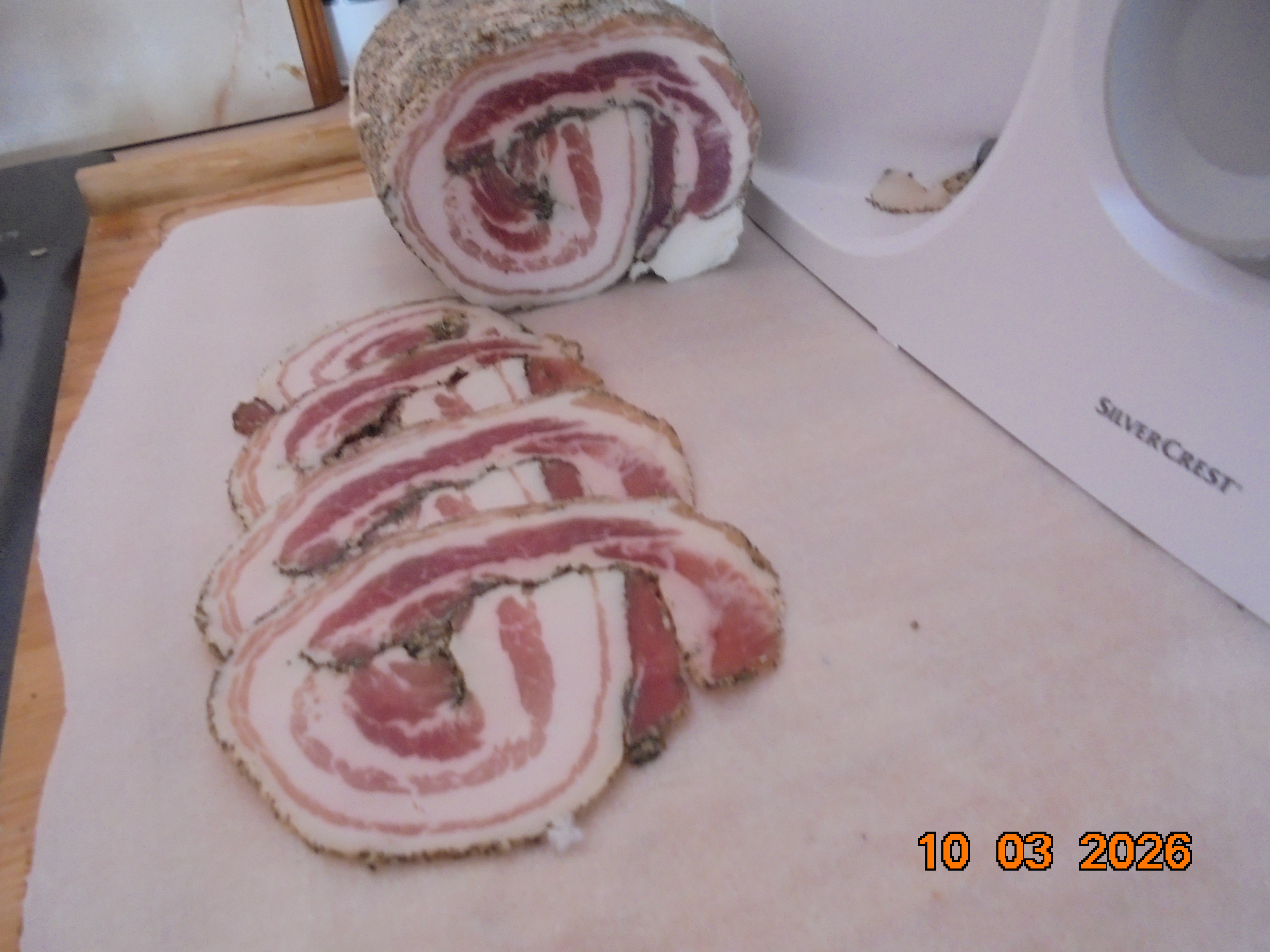 A mon retour début d'après midi, j'ai trancher ma pacetta 1kg350 et une coppa marinée au vin rouge de 1kg650.